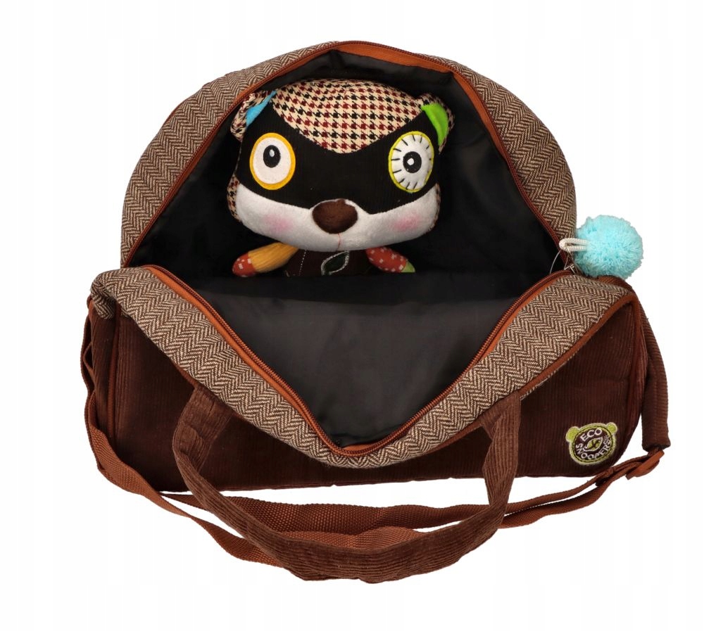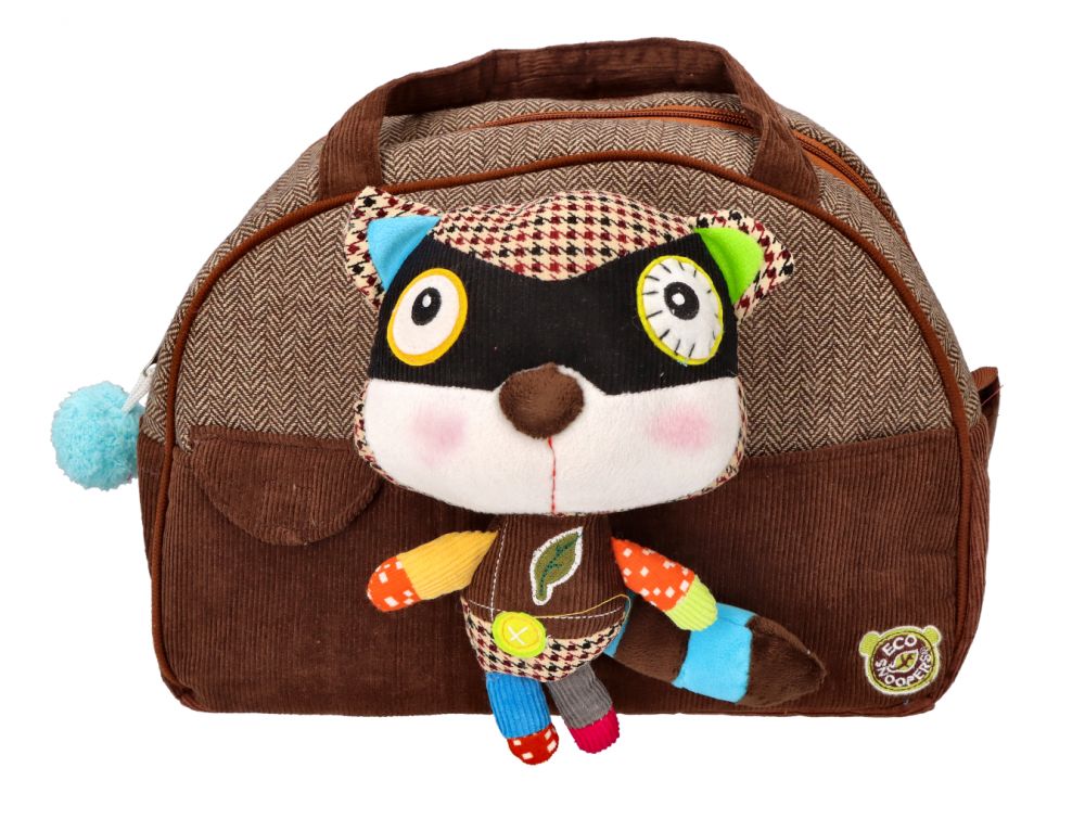 Представляємо гарну і барвисту сумку з єнотом. Сумка виготовлена з вельвету і застібається на блискавку. На кінці блискавки є м'який помпон для легкого відкривання та закривання. Спереду прикріплений талісман, який привертає увагу завдяки численним швам, фактурам і використаним матеріалам. Талісман кріпиться на липучці, тому його можна легко від'єднати і взяти з собою. Дітям подобається, коли з ними завжди є друзі, особливо коли вони йдуть в дитячий садок або з батьками на прогулянку або в подорож.
