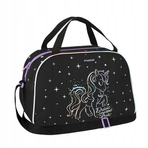 Велика, містка сумка для дівчинки, містке відділення, обшите підкладкою, що легко миється, малюнок з милим Єдинорогом, регульований плечовий ремінь, міцна блискавка. Голографічна сумка STARPAK Unicorn - це акуратна і дуже зручна сумка для дівчаток. Ідеально підходить для подорожей і школи. Завдяки цьому дитина може взяти з собою найнеобхідніше. А як ви знаєте, ніч у мого друга була б неможлива без них! Сумка через плече STARPAK має одне відділення, що закривається на міцну блискавку. Відділення обшито підкладкою, яка захищає сумку від забруднень і дуже легко чиститься. Завдяки регульованим лямкам їх легко регулювати під зріст дитини. Крім того, має короткі ручки для носіння сумки в руках. Чорна сумка з фіолетовими вставками та голограмою. Також ознайомтеся з іншими продуктами STARPAK з голографічної серії. Виріб призначений для дітей віком від 3 років. Розміри виробу (довжина x висота x глибина) [см]: 39x27x16. Вага виробу 0,30 кг. Сумка упакована в фольгу. Коробка 12 шт.