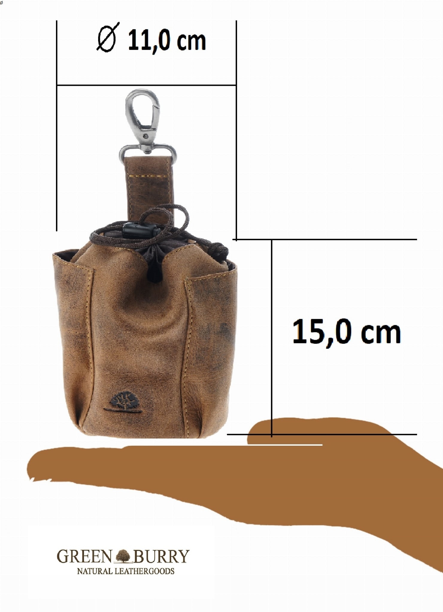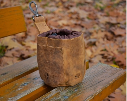 Пісумка для ласощів собак, у формі сумки з можливістю кріплення на поясі, виготовлена з високоякісної натуральної шкіри, обробленої вручну з натуральними танінами, що надає їй унікальний вигляд і текстура в класичному відтінку "постарілий" коричневий.