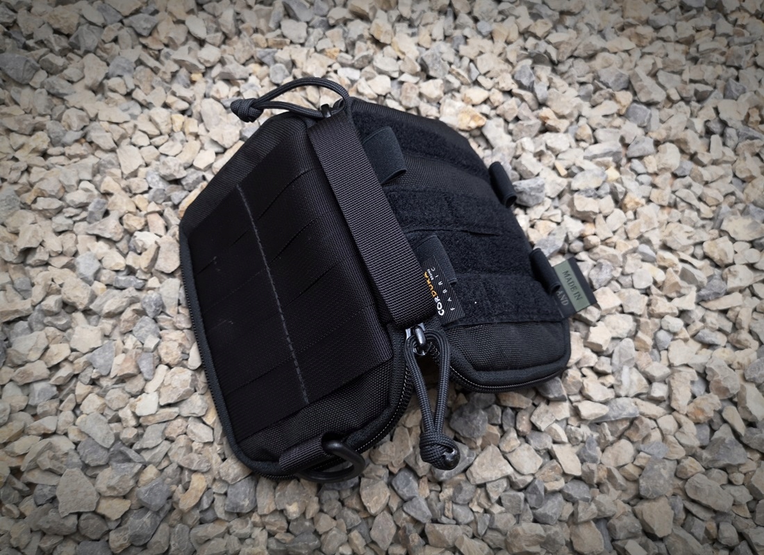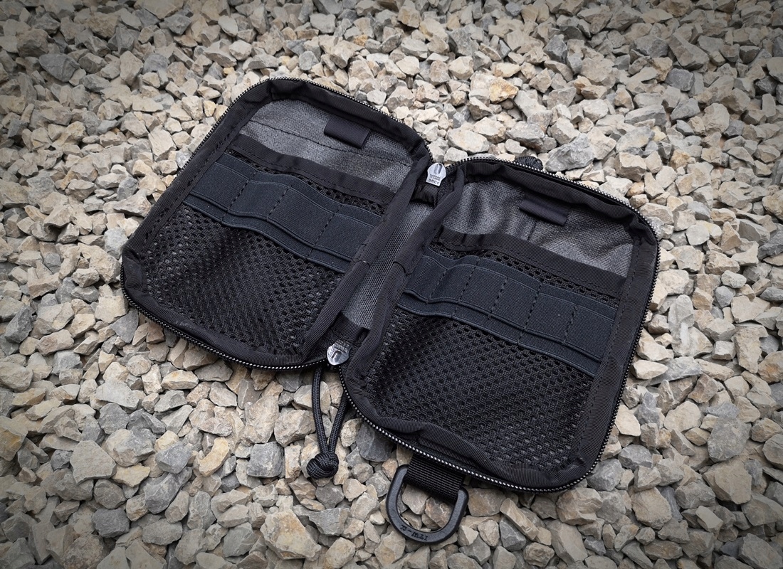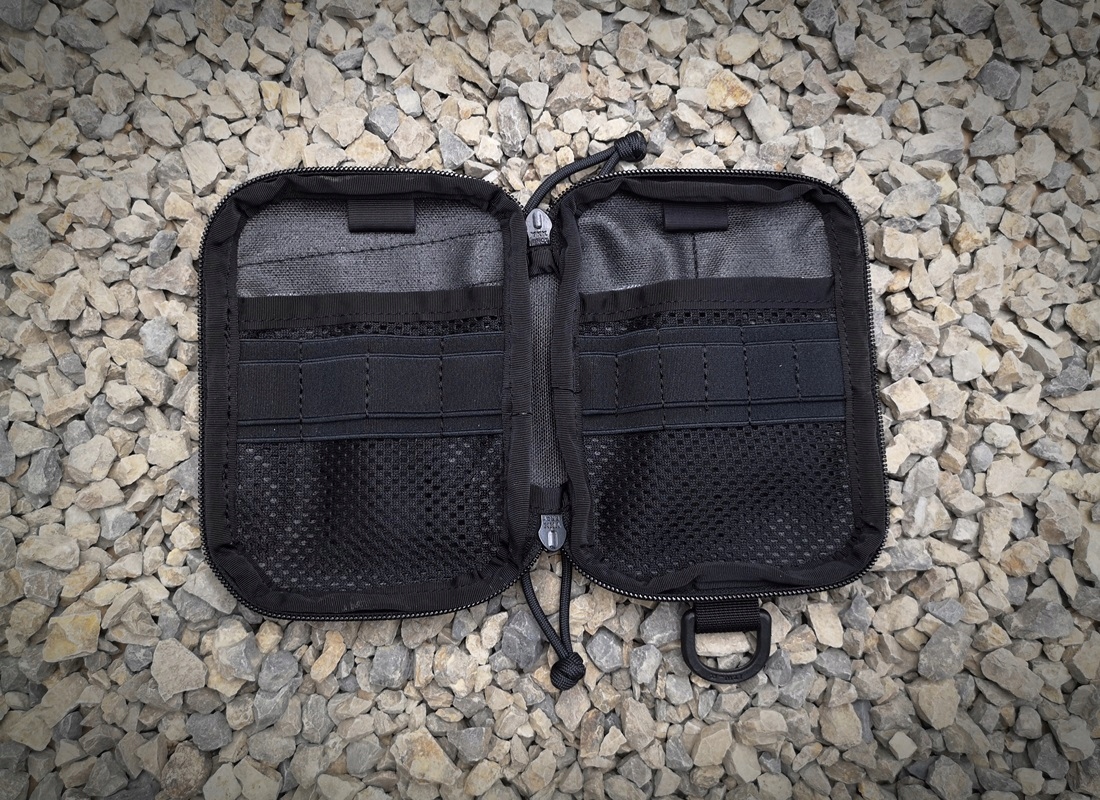 На передній частині органайзера є панель на липучці з ремінцями Molle, які можна прикрити нашивками, нашивками моралі, прикріпити до карабіна, прикріпленого до додаткового мішка або переплетеного ножа до нього за допомогою паракорду. Гумки з боків для ручок, ліхтариків, кременків, маленьких куботанів і т. д. Всередині є відділення, куди ідеально поміститься блокнот, телефон або інший плоский предмет. Завдяки сітці видно, що всередині. На кишеню вшита гумка, створюючи відділення шириною: 4 см; 3,5 см; 2 см. Зверху є петля для кріплення ключів, мотузок і т. д. З іншого боку є ще одна сітчаста кишеня з гумовими відділеннями шириною 5 см; 3 см; 2,5 см