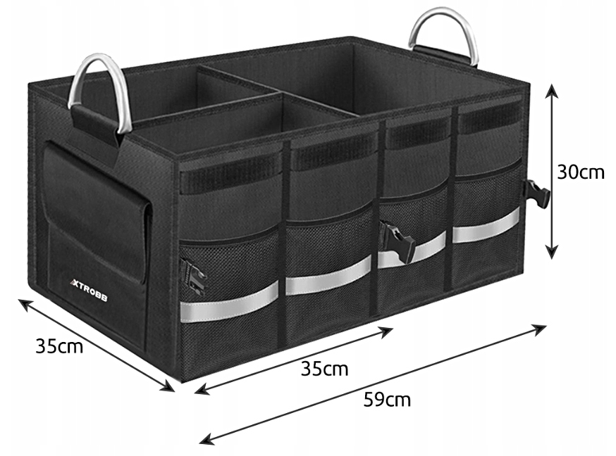 Автомобільний органайзер великий, в нього легко помістяться різні аксесуари, покупки або речі для кемпінгу / пікніка / подорожі. Має жорсткі стінки і підлогу і коли він не використовується, його можна швидко скласти до невеликого розміру.