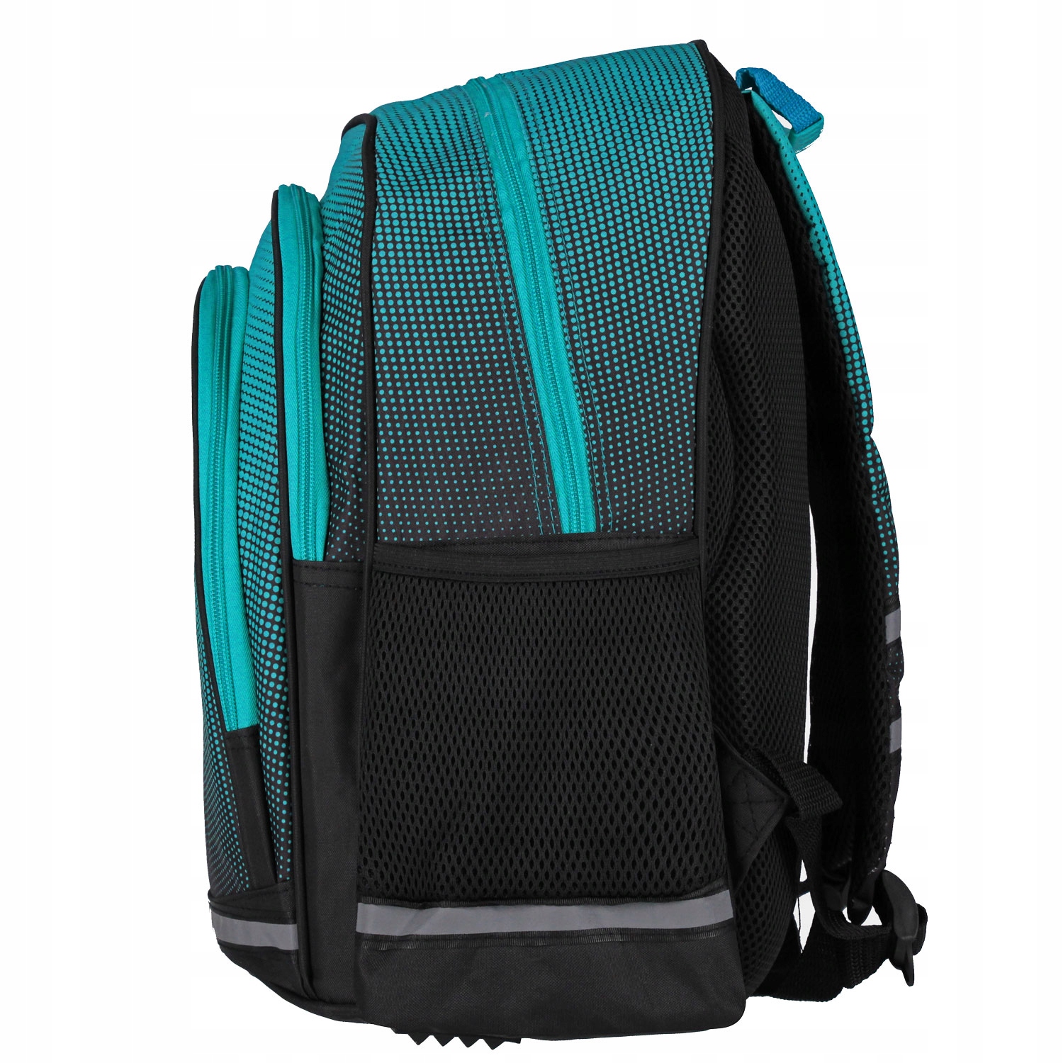 - Рефлексивні смуги, розміщені на передній кишені, як на бічних кишенях, так і на бреках, що збільшують видимість рюкзака вночі безпеки дитини