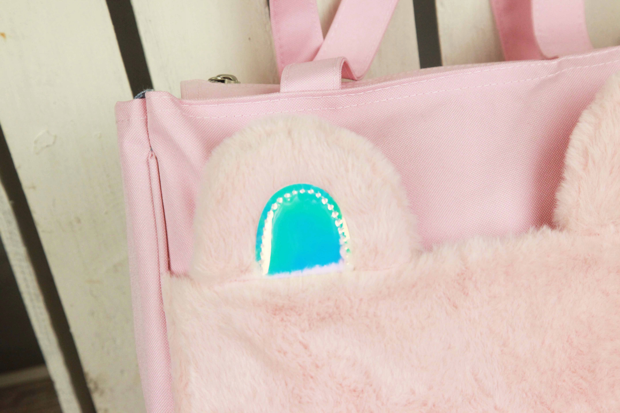 Передня кишеня покрита м'яким хутром. 3D вушка і сердечка на дні сумки зроблені з голографічного матеріалу, який чудово відбиває світло. Кишеня на блискавці.