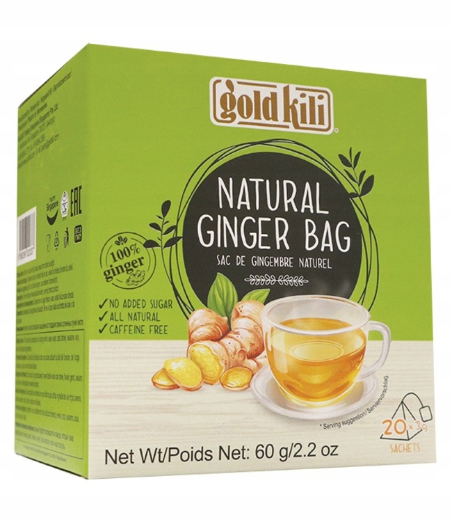 Gold Kili Natural Ginger Bag — це натуральний імбир, упакований у пакетики, які легко заварювати. Він може чудово освіжити вас у спекотні дні або приємно зігріти вдома під ковдрою :)