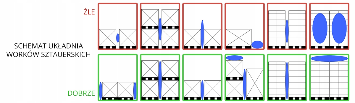 Щоб подушки виконували своє призначення, вони повинні бути розташовані відносно вантажу, що транспортується. На діаграмі вище ви можете побачити приклади поганого та корисного використання подушок. Золотого правила немає, і кожен транспорт потребує індивідуального підходу та використання різних рішень.