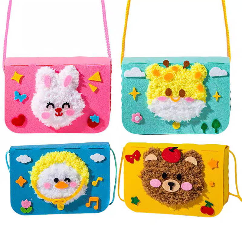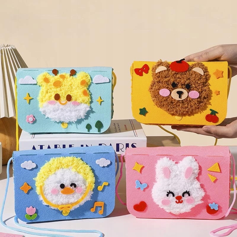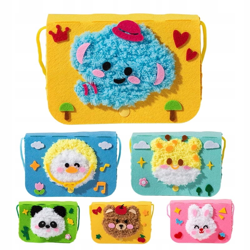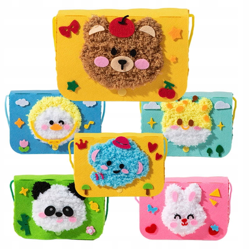 - набір елементів з фетру з інструментами для шиття - набір містить вирізані елементи з фетру на задану тему, які необхідно зшити вручну. На лицьовій стороні сумки необхідно вишити спеціальною жирною (злегка пухнастою) ниткою вказану фігуру - голова ведмедика (коричневого або білого кольору), зайчика, оленя, качечки, слоника. Додатково на елемент слід приклеїти очі або менші фетрові елементи
