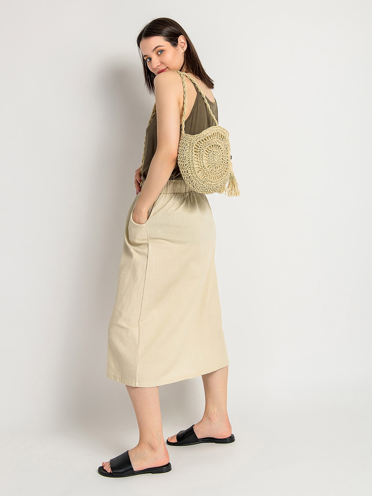 Ми запрошуємо вас у світ унікального стилю! Наша бежева сумочка Beige є обов'язковою для цьогорічних літніх подорожей! Завдяки довгому поясу ви можете легко покласти його через плече, що робить його надзвичайно зручним для носіння. Крім того, елегантний кулон біля пояса додає щіпку чарівності і робить сумку по -справжньому модною!