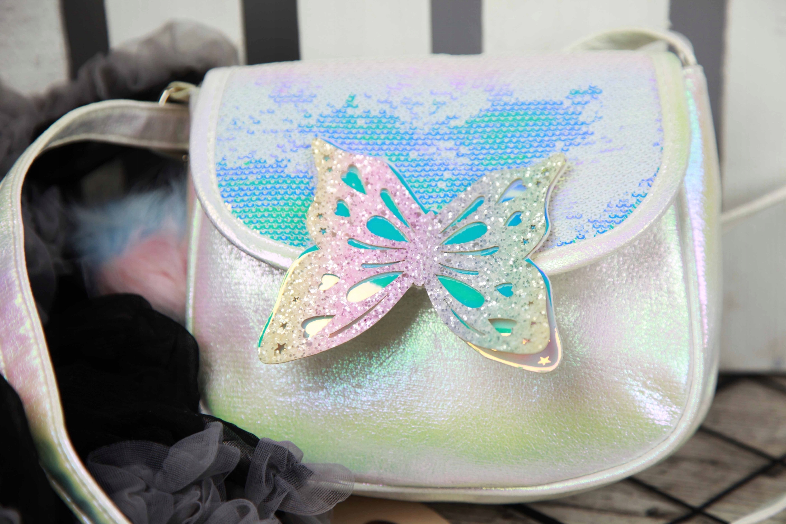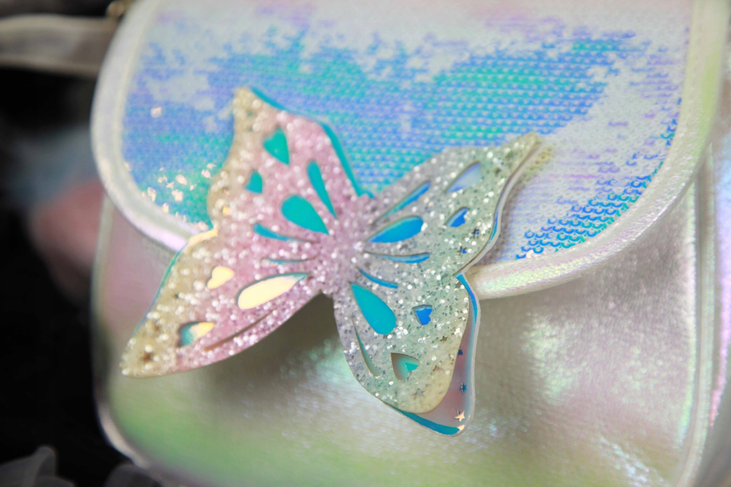 Клапан сумки вишитий чудовими блискучими блискітками. Крім того, чарівності додає дивовижний метелик, крила якого вкриті блискучими частинками. Крім того, до сумки йде брелок з банок пастельних тонів.