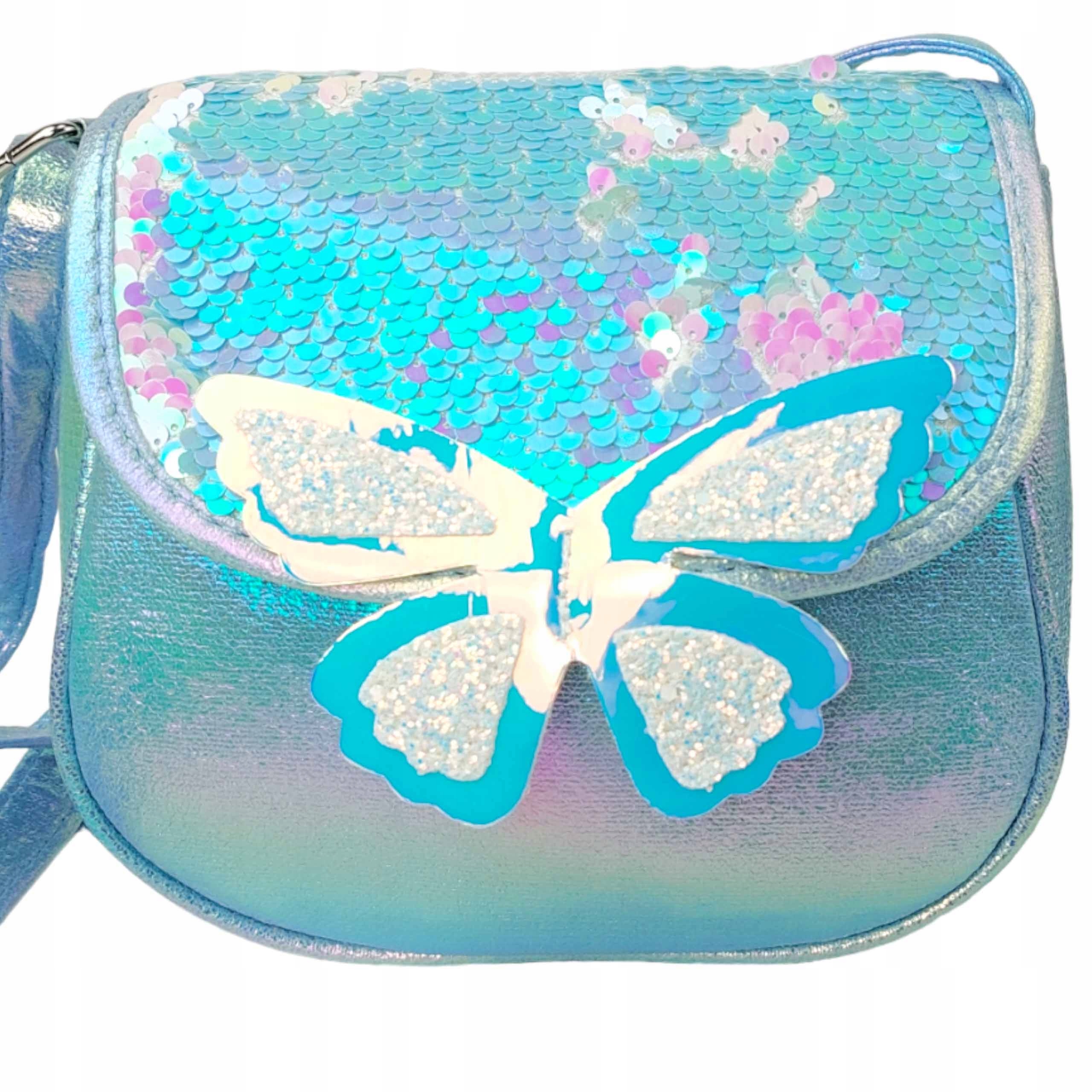 Клапан сумки вишитий чудовими мерехтливими блискітками. Крім того, дивовижний метелик, крила якого зроблені з голографічного матеріалу, а всередині покриті блискучими частинками, додає чарівності.