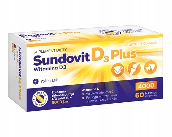 SundovitD3 Plus містить вітамін D, який допомагає підтримувати здоров'я кісток і зубів. Підтримує правильне функціонування м'язів та імунної системи. Це допомагає в правильному засвоєнні та використанні кальцію та фосфору, а також у підтримці належного рівня кальцію в крові. Бере участь у процесі поділу клітин. Через знижену ефективність шкірного синтезу та потенційно знижене всмоктування з шлунково-кишкового тракту та змінений метаболізм вітаміну D 19 лютого 2021 року команда дієтичних добавок висловила думку щодо максимальної дози вітаміну D у групі здорових людей старше 75 років. років, що становить 4000 МО. у добовій дозі.