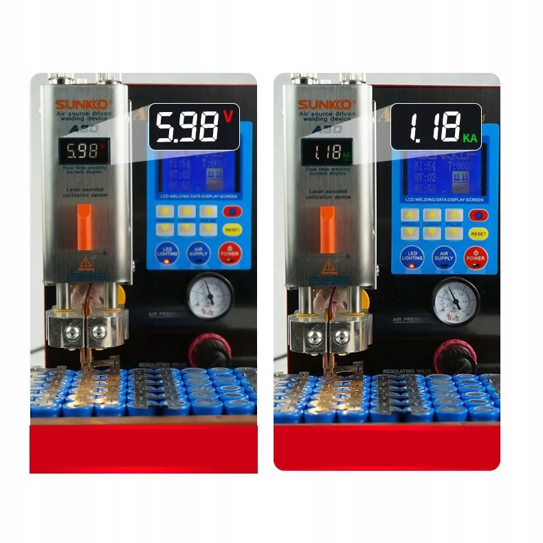РК -дисплей показує параметри зварювання параметрів, а манометр показує тиск повітряного компресора. Кількість імпульсу, зварювальної потужності та тиску повітряного компресора можна зручно регулювати за допомогою кнопок та ручки. зварювання. машина.