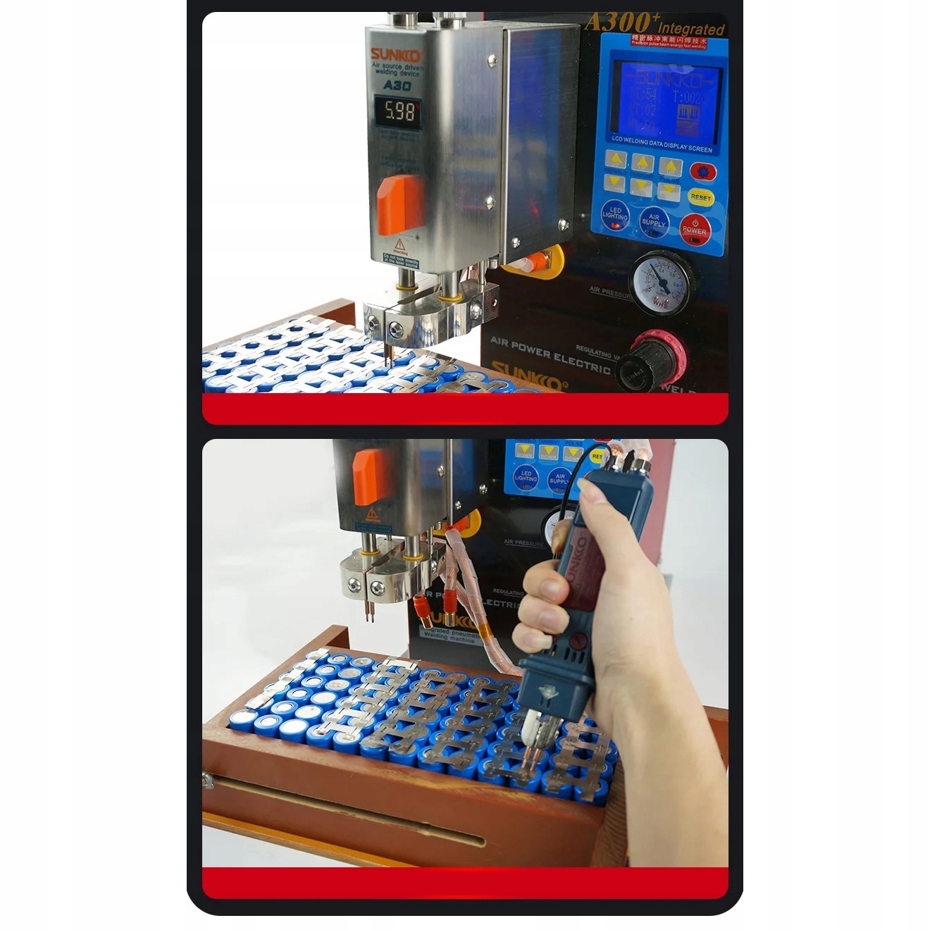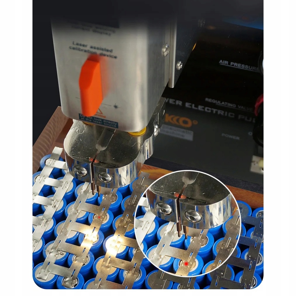 інтегрована машина A300+ подвійна функція використовує вбудований дизайн повітряного компресора, заощаджуючи додатковий простір та проводку, необхідні для встановлення зовнішнього повітря Батареї. Чистий нікель товщиною 0,2 мм і нікель товщиною 0,25 мм можна зварювати з максимальним зварювальним струмом 1200a. Лазер і освітлення, що допомагає в точному налаштуванні зварювальних гол. Тиск зварювання голки можна зручно відрегулювати з верхнім лицарем.
