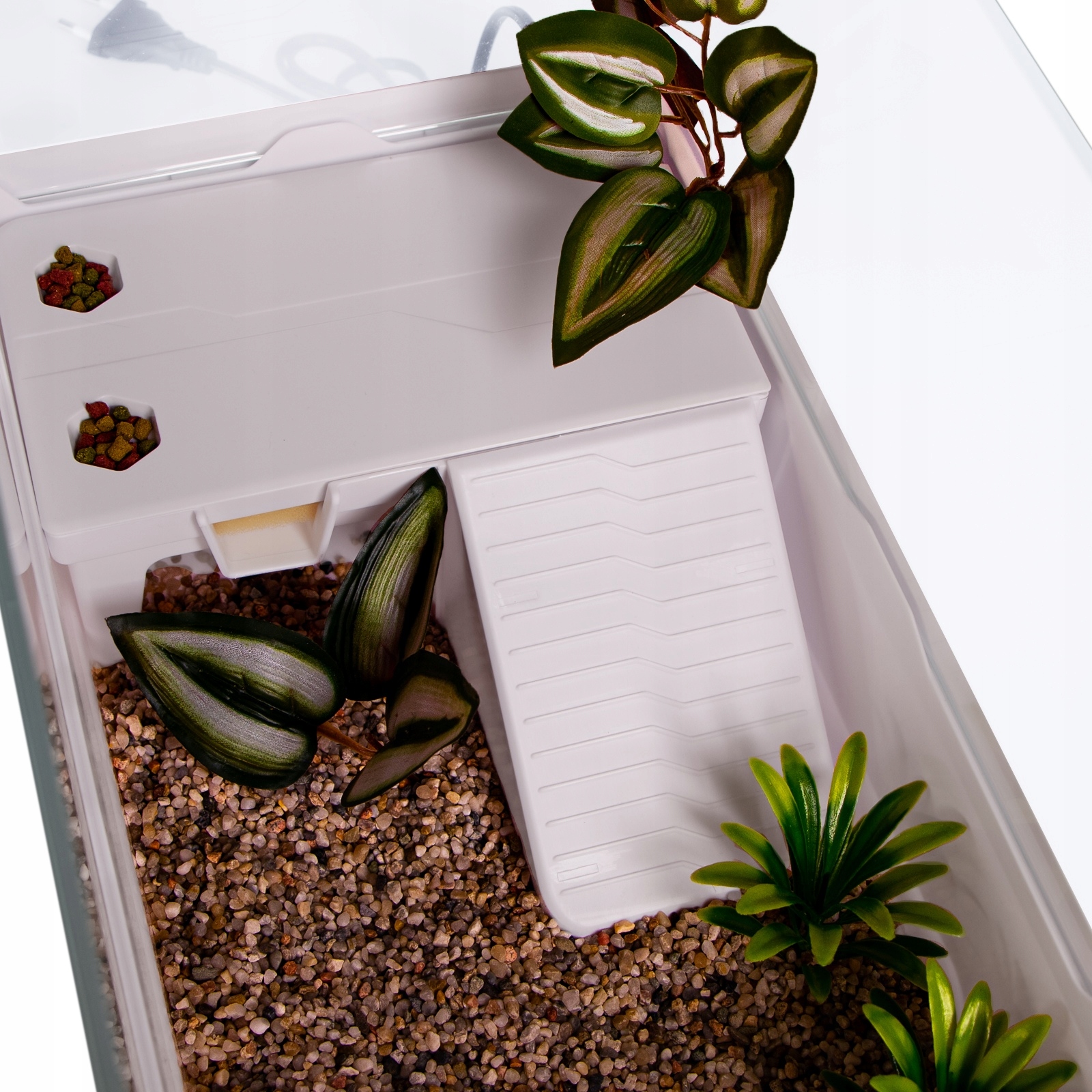 ✅ Острів з пандусом:Акватераріум оснащений практичним і естетичним острівцем, до якого черепаха може легко дістатися завдяки вбудованому пандусу. Сходинки забезпечують безпечний і легкий підйом на суху поверхню, де черепаха може відпочити та насолодитися сонцем.