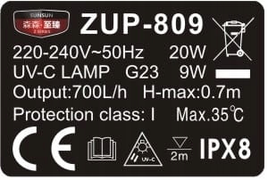 вбудований у лампі ZUP-809 UV-C -найефективніший засіб, що усуває водорості, бактерії або паразити в акваріумній воді. Ультрафіолет з високою інтенсивністю вбиває бактерії та інші патогенні організми у воді та обмежує виверження водоростей.