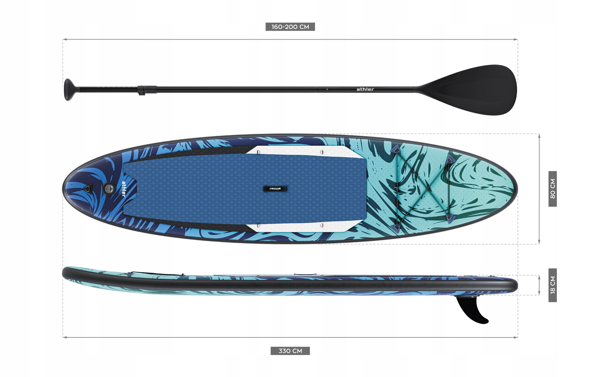 - Протиковзкий верхній килимок забезпечує стабільність і впевненість у ваших кроках навіть у складних умовах. завдяки чому він підходить як для перших кроків, так і для більш досвідченого користувача. Ширина понад 80 см і довжина 335 см роблять його ідеальним вибором для спокійного дослідження водойм і активного дозвілля Надувна SUP дошка Athler Sea