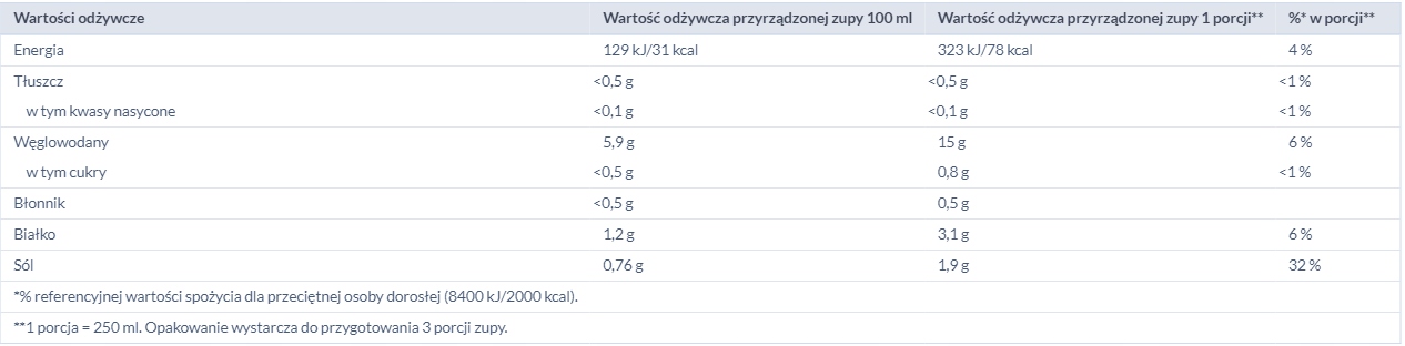 Інгредієнти: Макаронні вироби (80%) (манна ПШЕНИЦЯ твердих сортів, борошно ПШЕНИЧНЕ), йодована сіль, дріжджовий екстракт, ароматизатори, мінеральна калійна сіль, сіль, крохмаль, курячий жир (0,5%), селера (0,4%), цибуля-порей (0,3%), петрушка (0,3%), розмарин, морква¹ (0,2%), помідори¹, цибуля¹, куркума, антиоксидант: екстракти розмарину, ¹Стійке вирощування