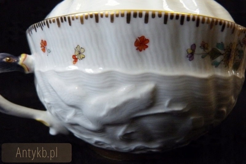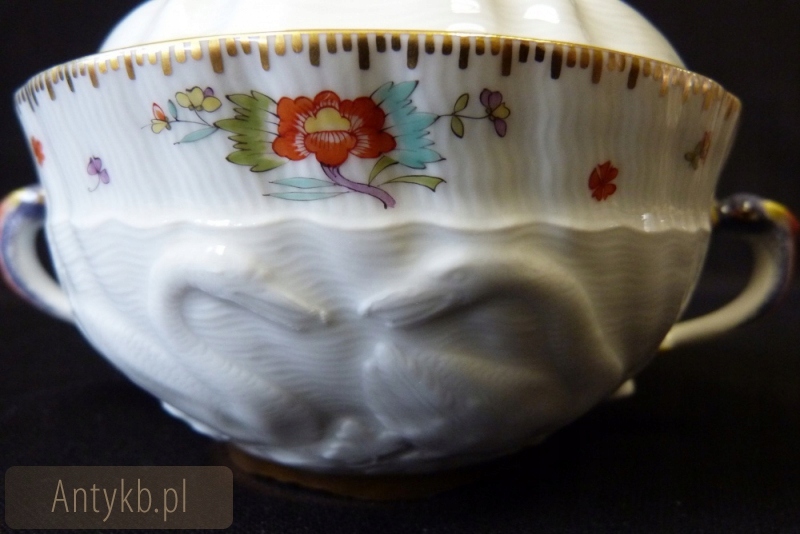 Чудовий супник чудової фабрики Meissen, виготовлений за зразком відомого сервізу Swan, створеного Йоахімом Каендлером на замовлення графа Брюля з Бродова, колись широко використовувався для подачі супу. Звісно, бульйонний суп – це сучасно, адже «Місна» все ще виробляє деякі елементи знаменитого сервізу. Це диво має рельєфи у вигляді лебедів, воно прикрашене індійською квіткою (indische Blume) і розсипаною квіткою, також має золоті облямівки. У такому поєднанні кольорів він найбільше схожий на сервіз лебедя. Чудо біле в дуже хорошому стані.Рекомендую.