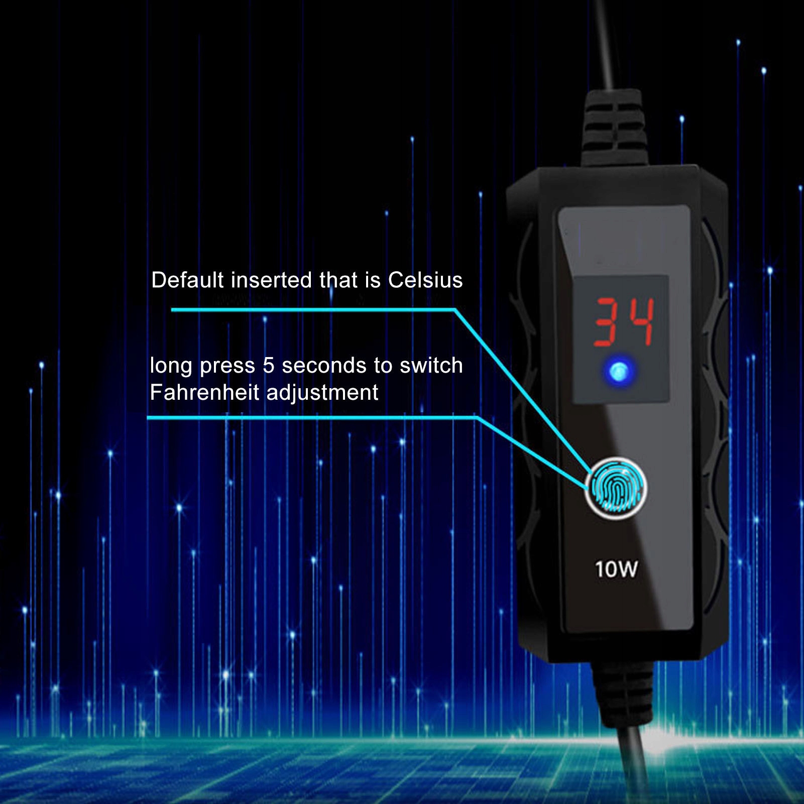 2. Цифровий дисплей: міні -радіатор акваріума має світлодіодний дисплей, щоб показати встановлену температуру та температуру води в режимі реального часу, з зондом з високою температурою, високою температурою.