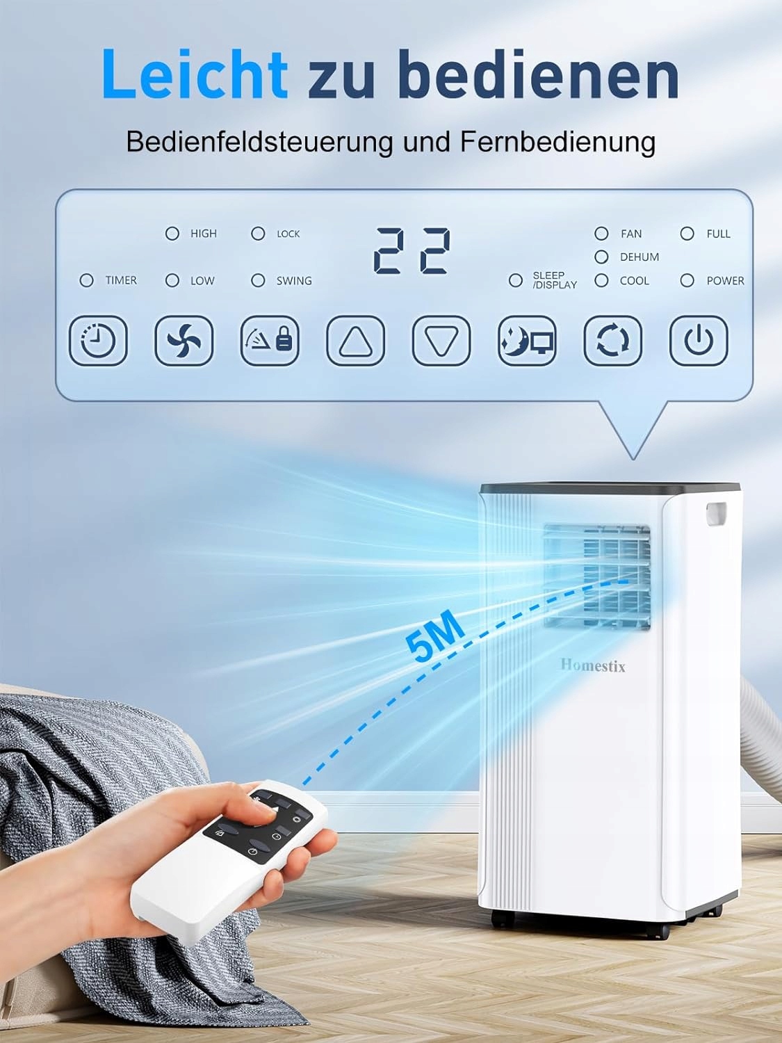Компактний дизайн, плавний рух: вага 23,5 кг і розміри 34,1 х 35,5 х 69,8 см, кондиціонер легко переміщати завдяки чотирьом колесам і бічним ручкам. Завдяки регульованій ущільнювальній пластині вікна та подвійним дренажним отворам він постачається з набором для встановлення вікон, який не вимагає свердління та сумісний із розсувними вікнами.
