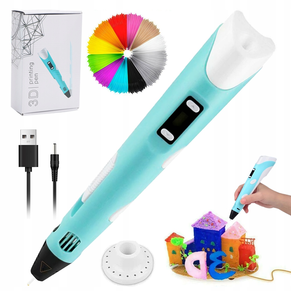 містить 12 штук пластикового пластику у випадкових кольорах, з 3-метровими волокнами, що дозволяє годинами писати, а також джерело живлення та поетапні інструкції.