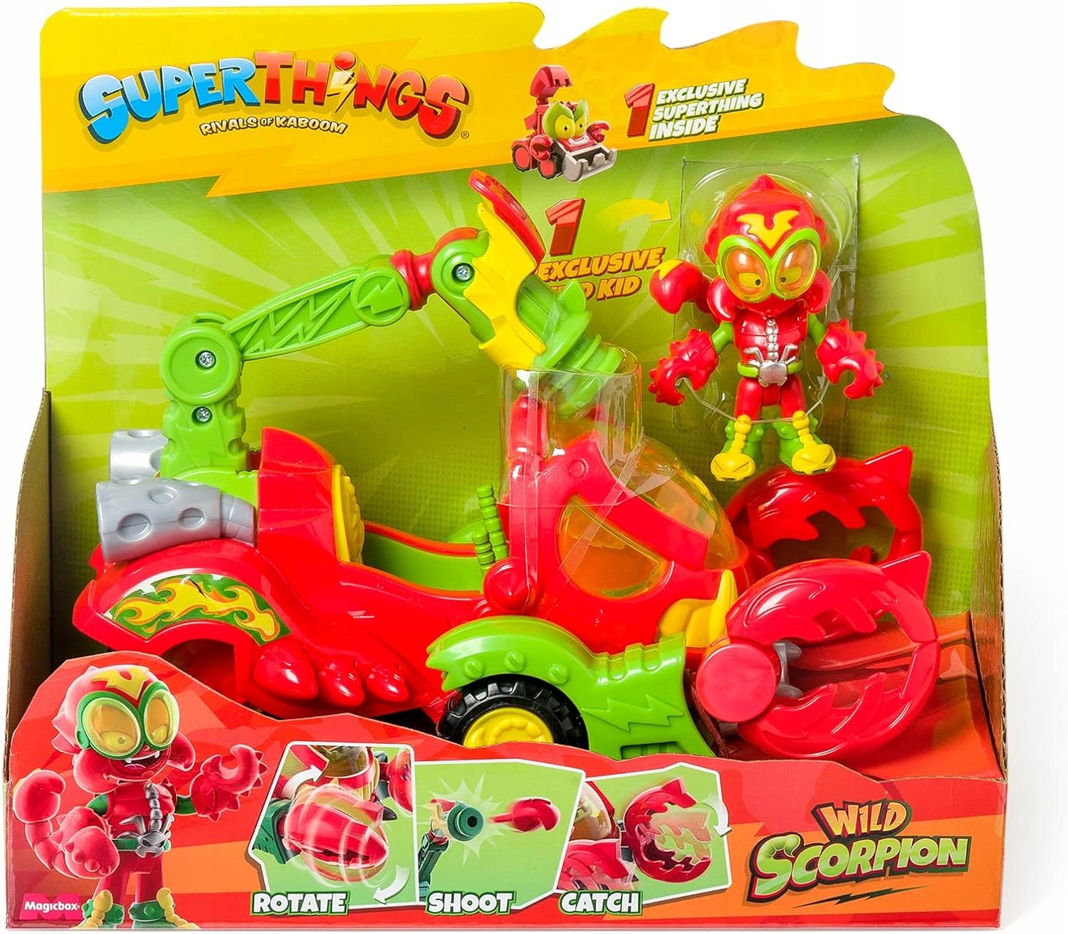 З потужними атаками тварин і вмілими пілотами починається найдикіший поєдинок! Відкрийте для себе всю міць Scorpion з ексклюзивним Wild Kid і SuperThing в кабіні. Дикий скорпіон має кігті для лову суперників, які обертаються під час його руху. Крім того, він може стріляти в Героїв своїм потужним жалом!