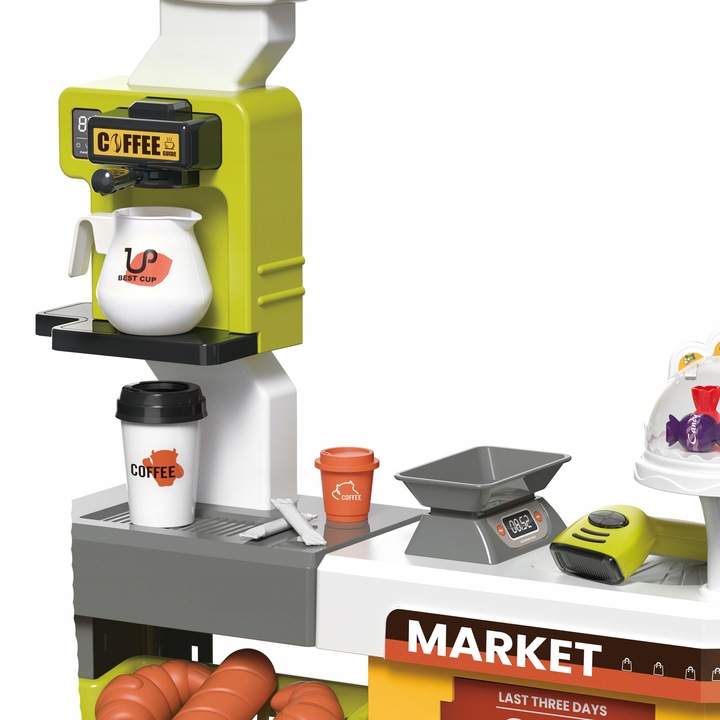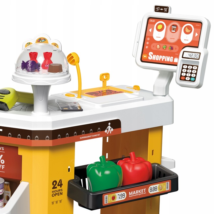 Цей набір для супермаркету дозволяє дітям вільно розвивати свої творчі здібності та соціальні навички, граючи за продавця, продавця або клієнта. Завдяки незліченній кількості привабливих аксесуарів, включаючи продукти, овочі, фрукти та солодощі, цей набір є нескінченним джерелом розваг.