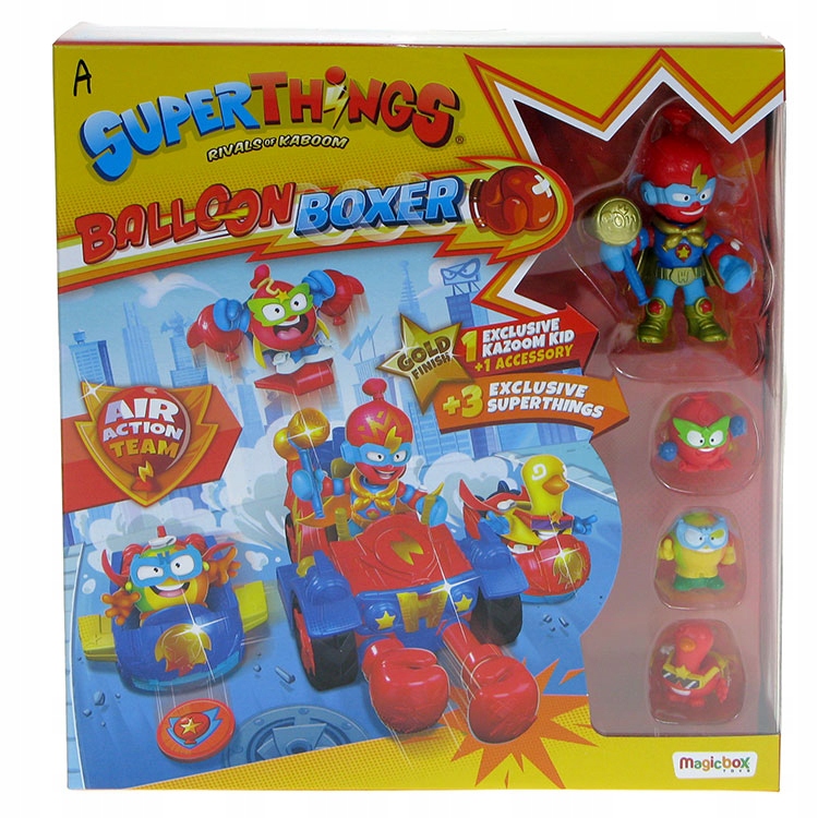 Kazoom Kids із нової серії SuperThings прибувають повним ходом! Супергерой Баллон Боксер вступає в бій зі своїм транспортним засобом, який не тільки засліплює золотистими деталями, але й здатний прорватися в будь-якій ситуації завдяки потужним кулакам. Чи зможе він перемогти? Звичайно, адже він не один! Його супроводжує Air Action Team, яка може приєднатися до основного автомобіля та стріляти дисками. Крім того, завдяки гнучкому елементу в задній частині автомобіля вони можуть стрибати з землі, щоб отримати додаткову потужність. Мегамашина Ballon Boxer готова перевезти всіх і захистити місто Кабум! Ви вирішуєте, чим закінчиться ця пригода!