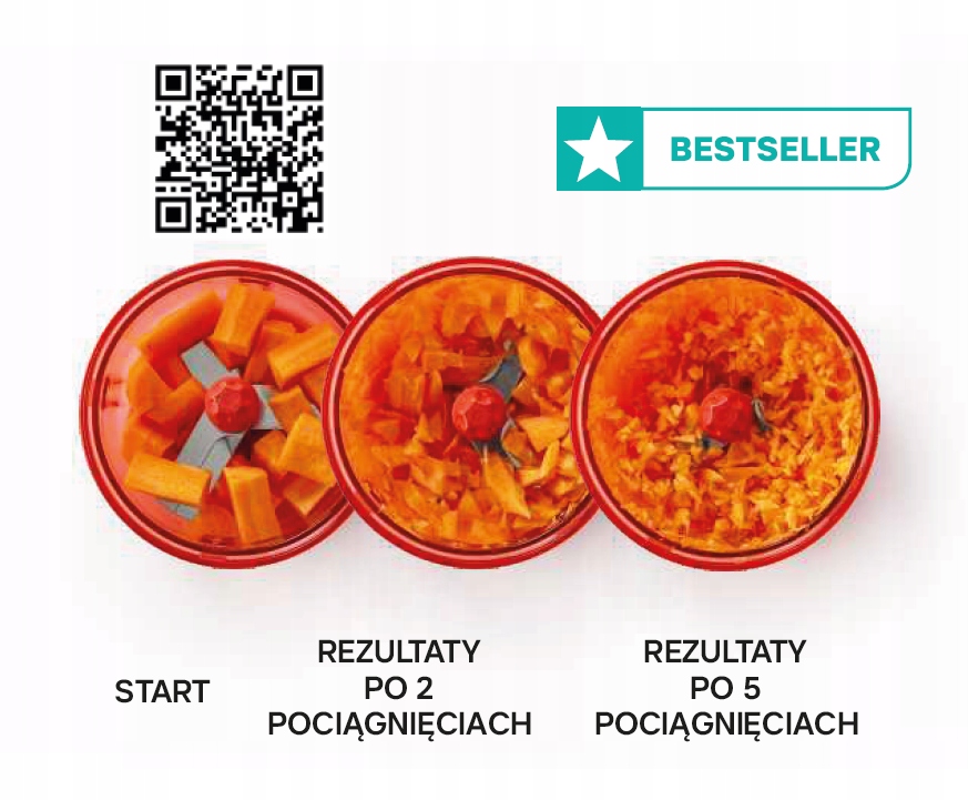 - Поєднання трьох лез і унікальної системи, яка приводить в рух леза шляхом потягування. струна гарантує подрібнення трав, подрібнення фруктів і овочів, горіхів за дуже короткий час.