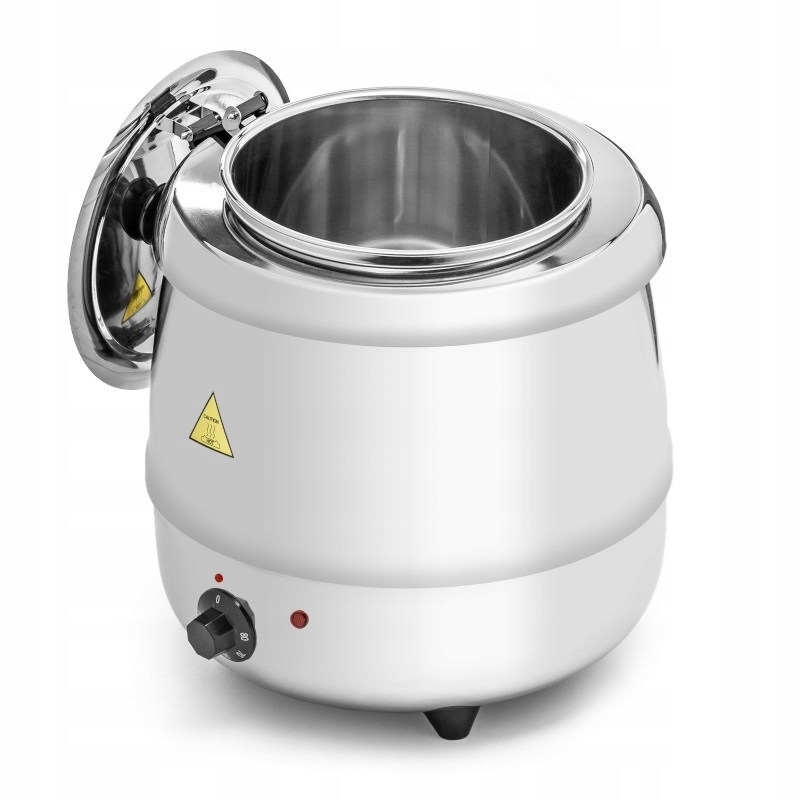 Електрочайник для розігріву супів і рагу об'ємом 10 л Корпус з нержавіючої сталі. Внутрішній алюмінієвий резервуар для води. Знімна ємність для супу з нержавіючої сталі товщиною 0,6 мм. Отвір для ковша в відкидній кришці з нержавіючої сталі. Стійкий до корозії корпус котла. Регулювання температури в діапазоні від 30 до 80oC.