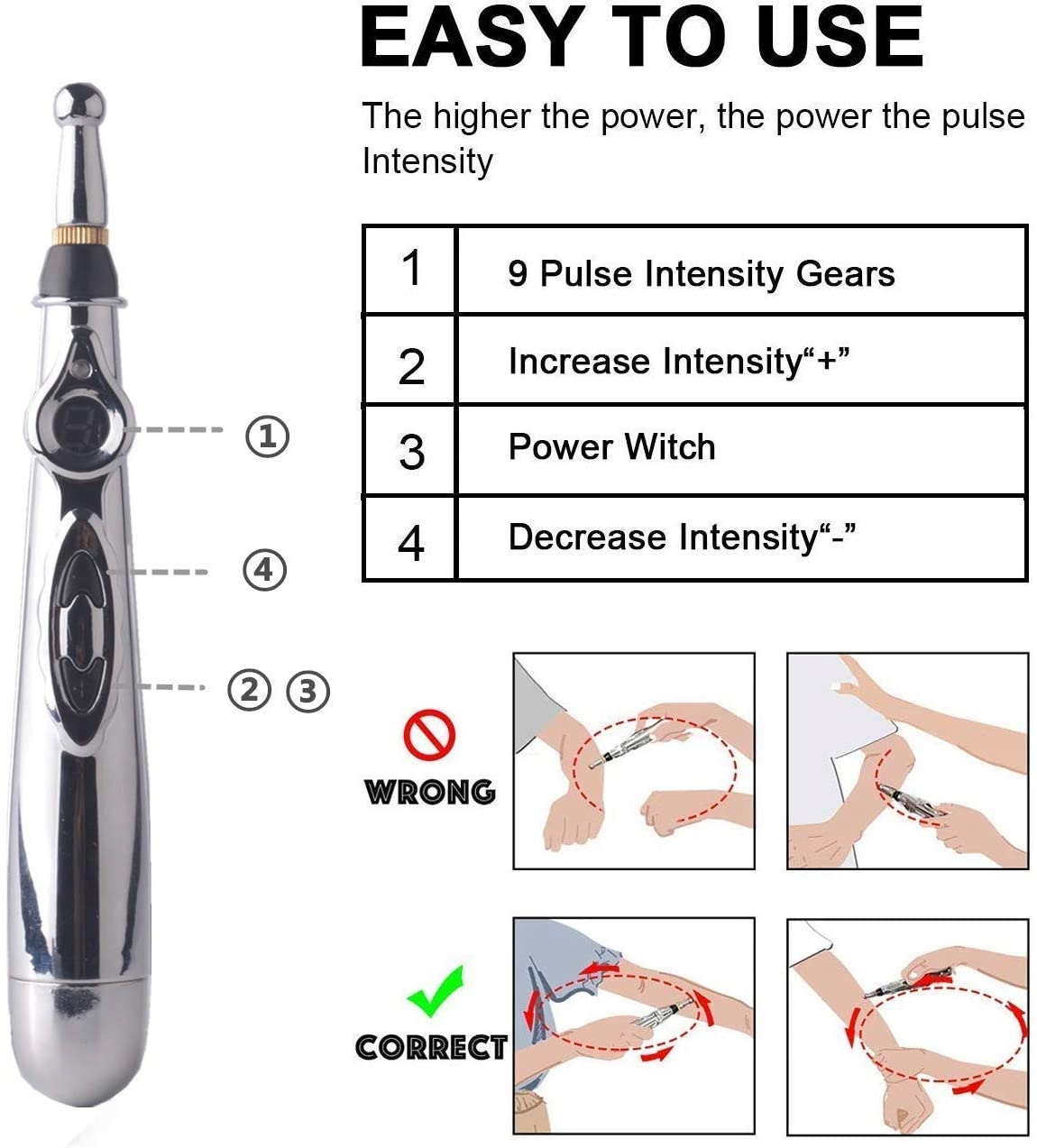 Простий у використанні — для роботи потрібна лише одна батарейка типу АА (не входить у комплект). Має цифровий дисплей, який показує силу вихідного електричного імпульсу (0 - найслабший і 9 - найсильніший). Просто натисніть кнопку «Пуск», щоб збільшити або зменшити силу електричного імпульсу.