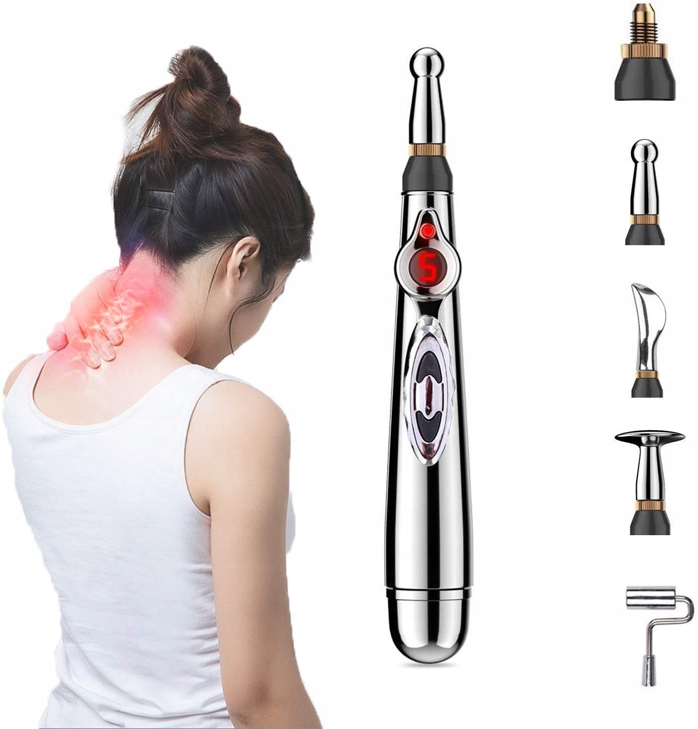 У комплект входить: 1 енергетична акупунктурна ручка, 5 різних типів головок, 1 посібник англійською мовою. Використовується одна батарейка типу АА (не входить у комплект).