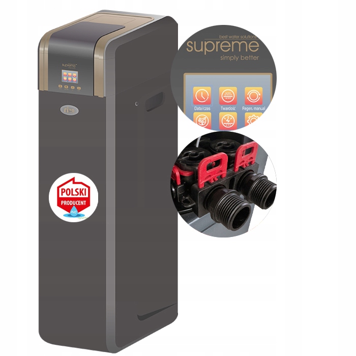 За стандартом SUPREME RIVA обладнано байпасом BY-PASS клапан і змішувальний пристрій MIXING, що дозволяє точно регулювати жорсткість води. Контролер має поршень, захищений тефлоновим покриттям, і зрозуміле меню польською мовою, що забезпечує комфортне та інтуїтивно зрозуміле керування.