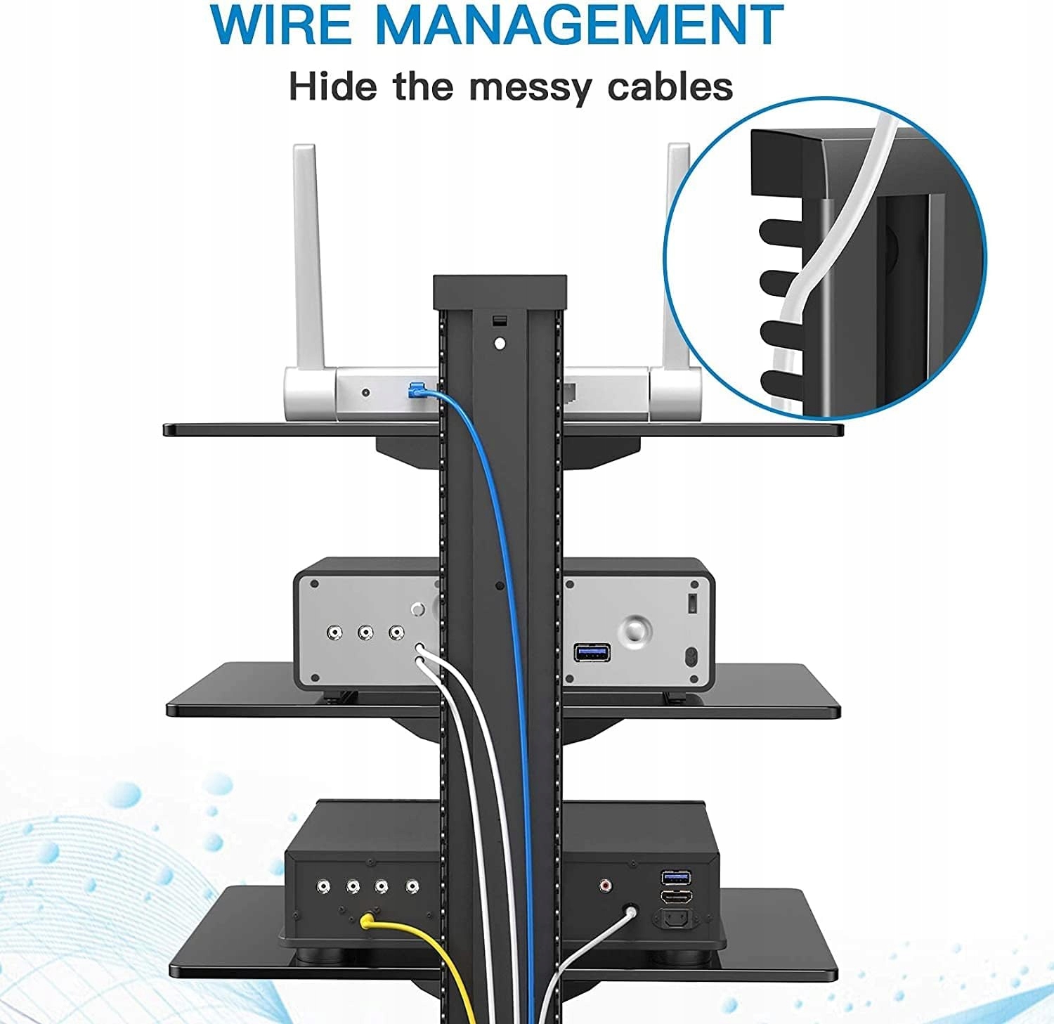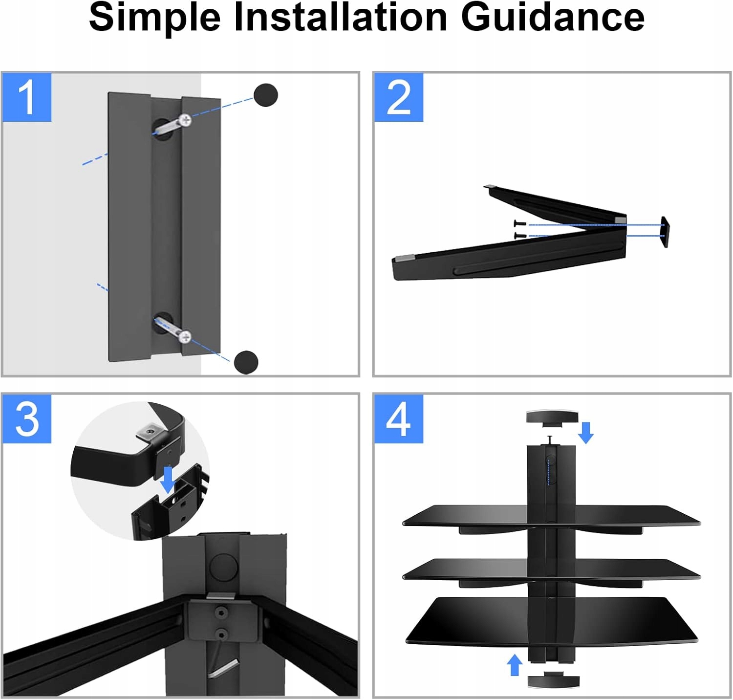 Настінна полиця складається з великої полиці із загартованого скла (380 x 280 x 4 мм на полицю), яка призначена для DVD/Blu - радіо, супутникові/кабельні декодери, ігрові консолі, динаміки HiFi та об’ємний звук.