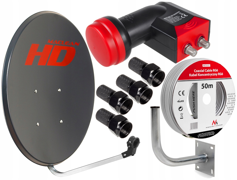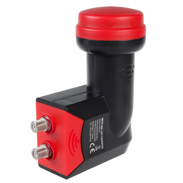 Подвійний перетворювач Maclean MCTV-252 є пристроєм преміум класу з дуже низьким коефіцієнтом шуму . Він може легко приймати сигнали HD. Конвертер кріпиться до супутникової антени в стандартному тримачі 40 мм.