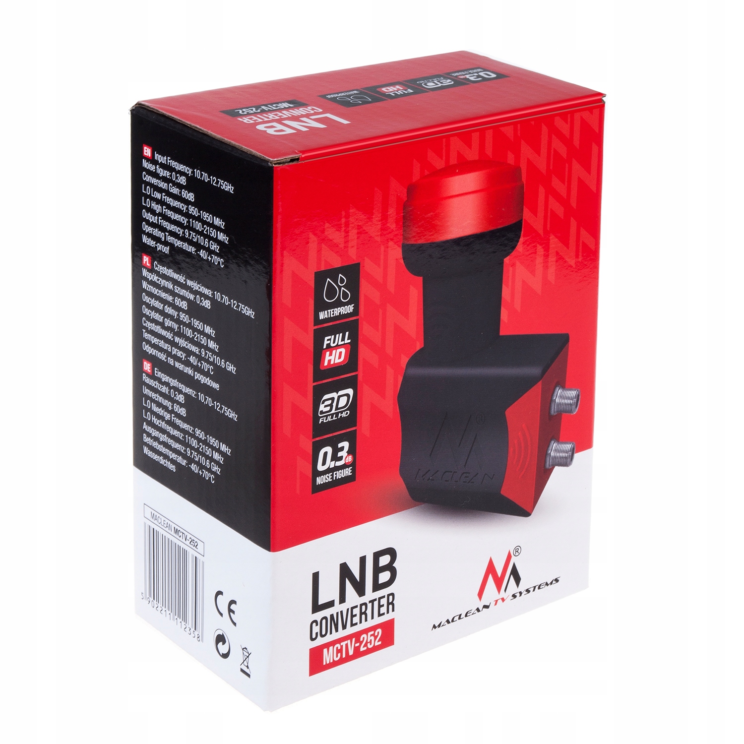 Подвійний перетворювач Maclean MCTV-252 - це пристрій преміум-класу з дуже низьким коефіцієнтом шуму . Він може легко приймати сигнали HD. Конвертер кріпиться до супутникової антени в стандартному тримачі 40 мм.