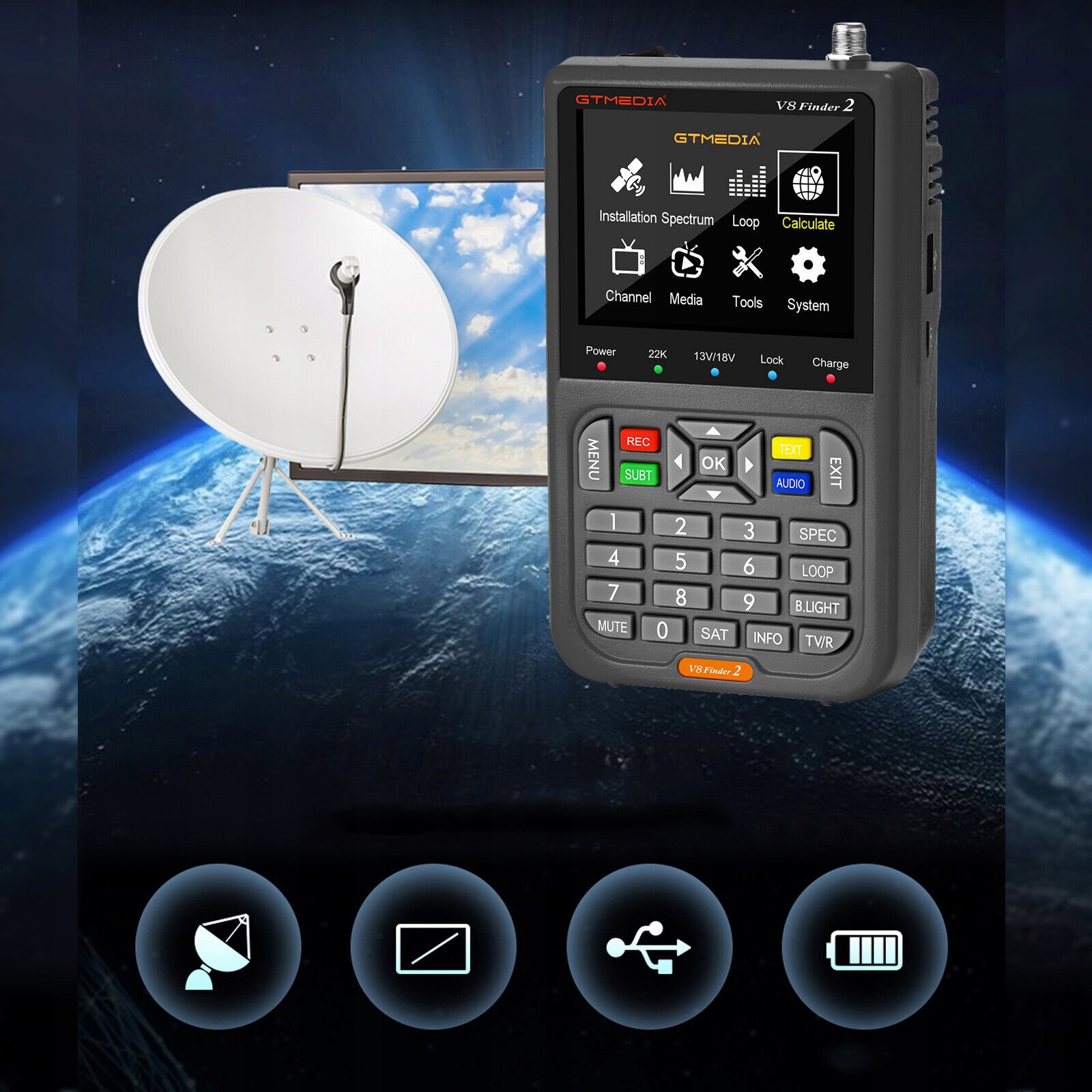 V8 Finder 2 — це портативний супутниковий вимірювач, сумісний із DVB-S/S2/S2X, який підтримує багато видів функцій, таких як циклічний пошук, аналізатор сузір’їв, аналізатор спектру та автоматичне обчислення кута AZ, ЕЛ.