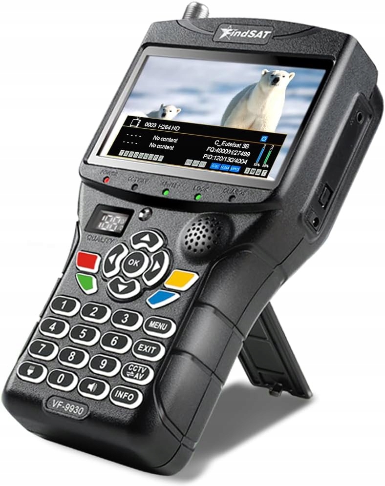 - Наземний цифровий вимірювач сигналу, оснащений 4,3-дюймовим РК-екраном з високою роздільною здатністю (Dots Piexl 800 X 480), підтримкою відео та телепрограмою в прямому ефірі, яка підтримує відображення потужності в реальному часі. Вимірювач супутникового пошуку з клавішами з підсвічуванням Для зручності роботи в умовах слабкого освітлення.