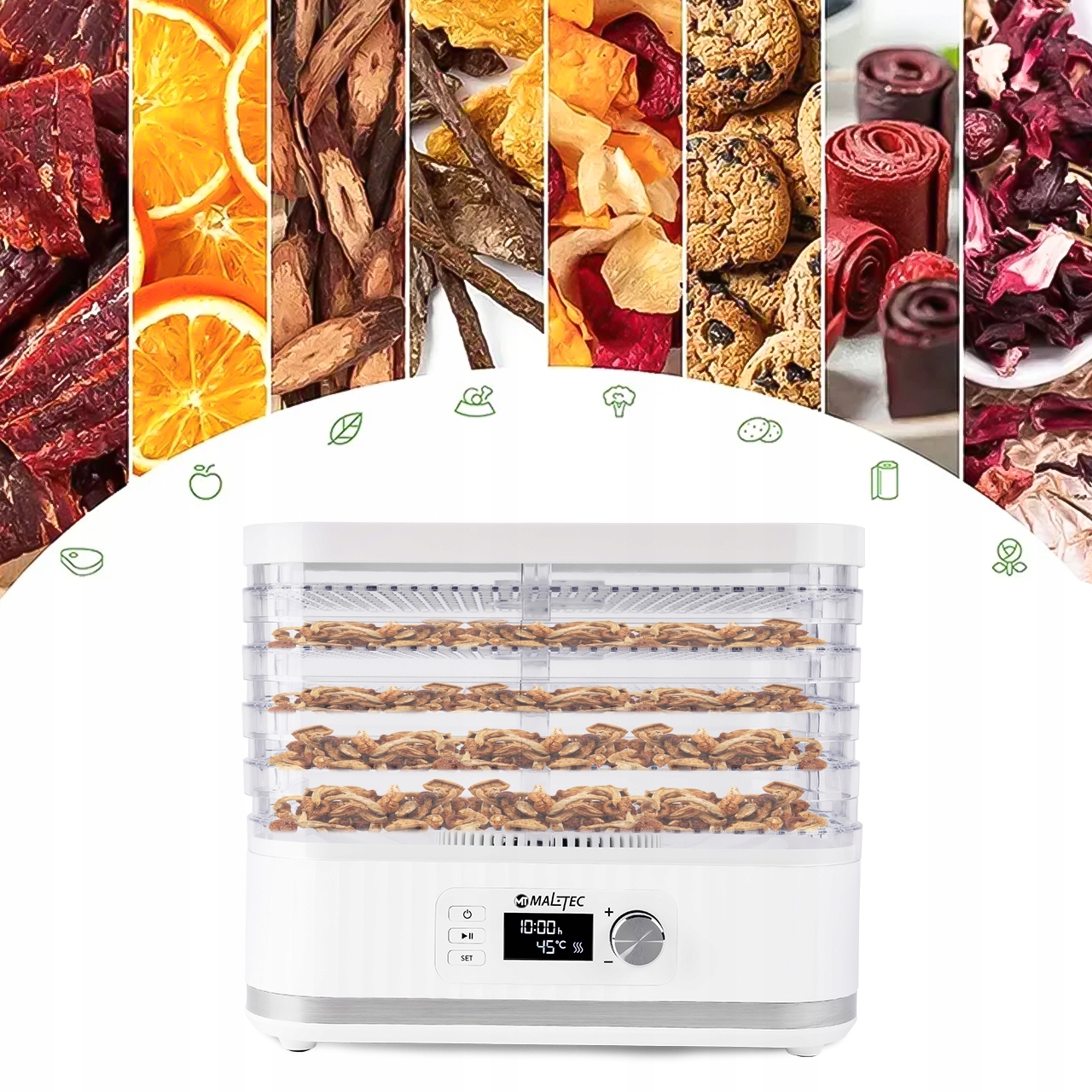 ➡️ 8-рівневе регулювання температури в діапазоні 35-70°C дозволить вам ідеально підібрати температуру до типу продуктів, які ви сушите.