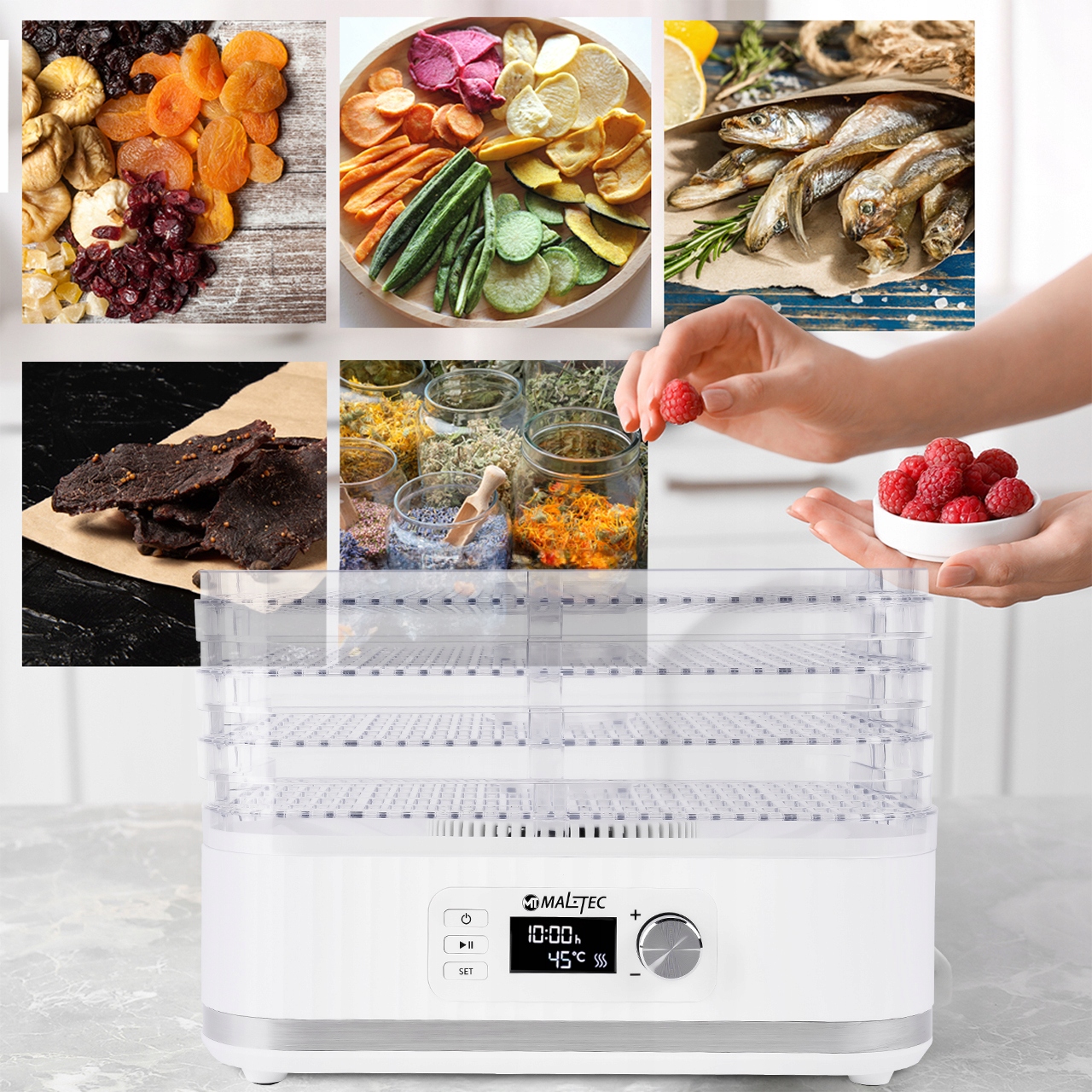 -> Смачно без консервантів - висушивши, ви довше збережете властивості ваших улюблених натуральних закусок, без використання консервантів, наприклад, сушених бананів, абрикосів, винограду (родзинки створюються).