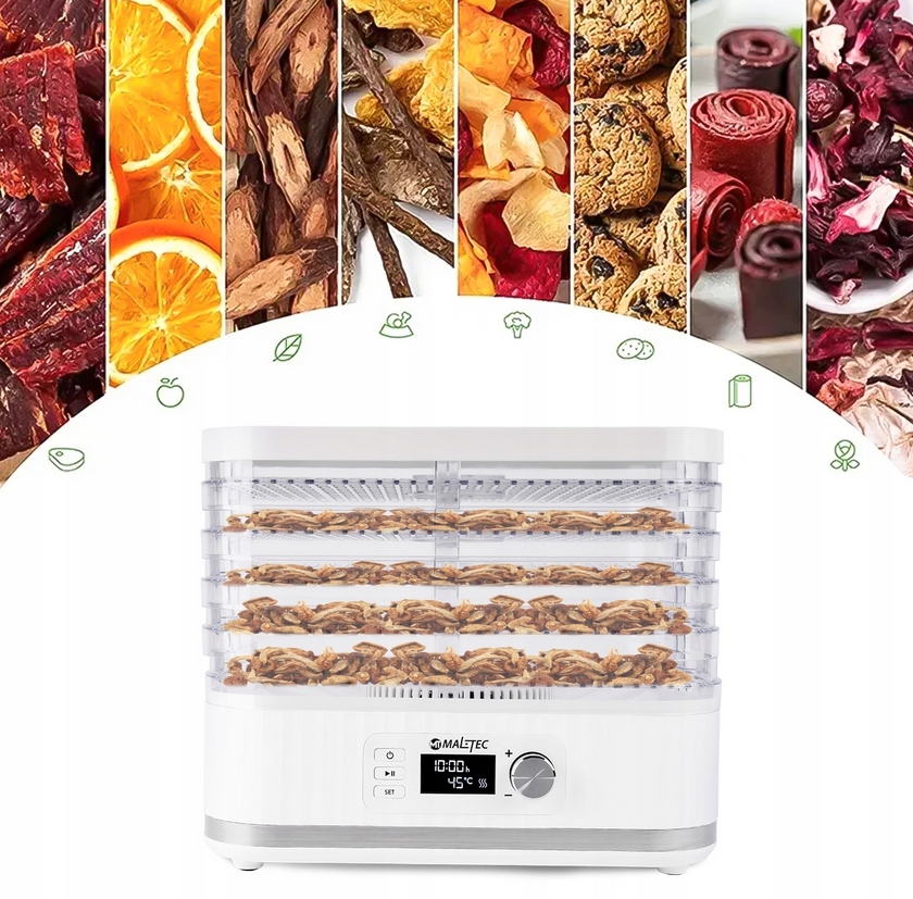 РЕГУЛЮВАННЯ ТЕМПЕРАТУРИ | ВИСОКА ПОТУЖНІСТЬ | ТАЙМЕР | 5 ЛОТОК | МОЖЛИВІСТЬ РОЗШИРЕННЯ | LED ДИСПЛЕЙ | СУЧАСНИЙ ДИЗАЙН | БЕЗ BPA | ДЛЯ ФРУКТІВ, ОВОЧІВ, ГРИБІВ, ТРАВ, М'ЯСА