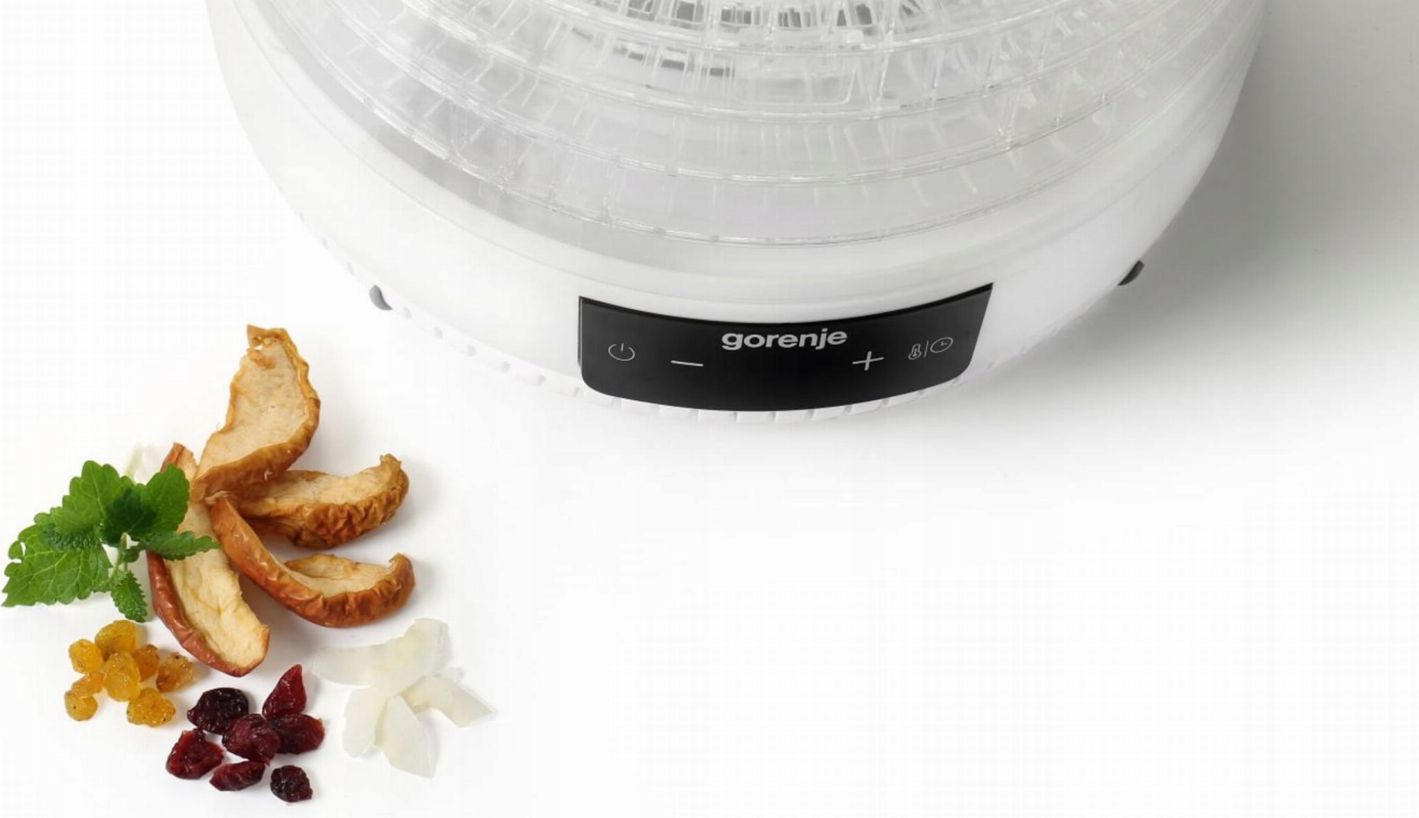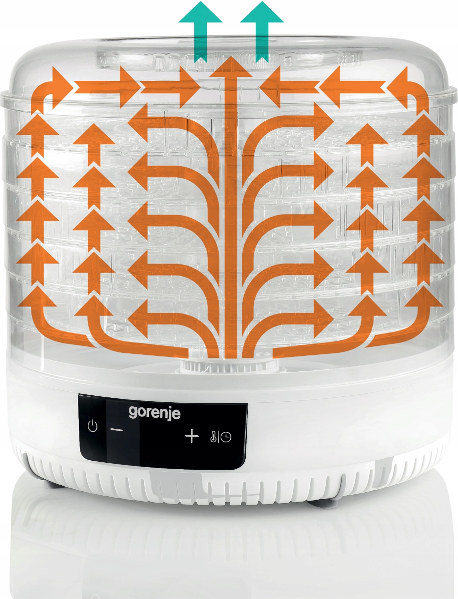 Осушувач харчових продуктів Gorenje може похвалитися горизонтальною циркуляцією повітря від основи, поступово переміщаючись уздовж лотків вентиляторами. Завдяки цьому запахи їжі не змішуються між собою, навіть якщо на одному підносі знаходяться різні види їжі.