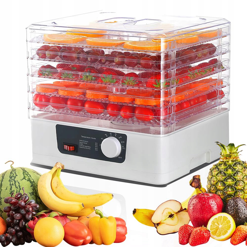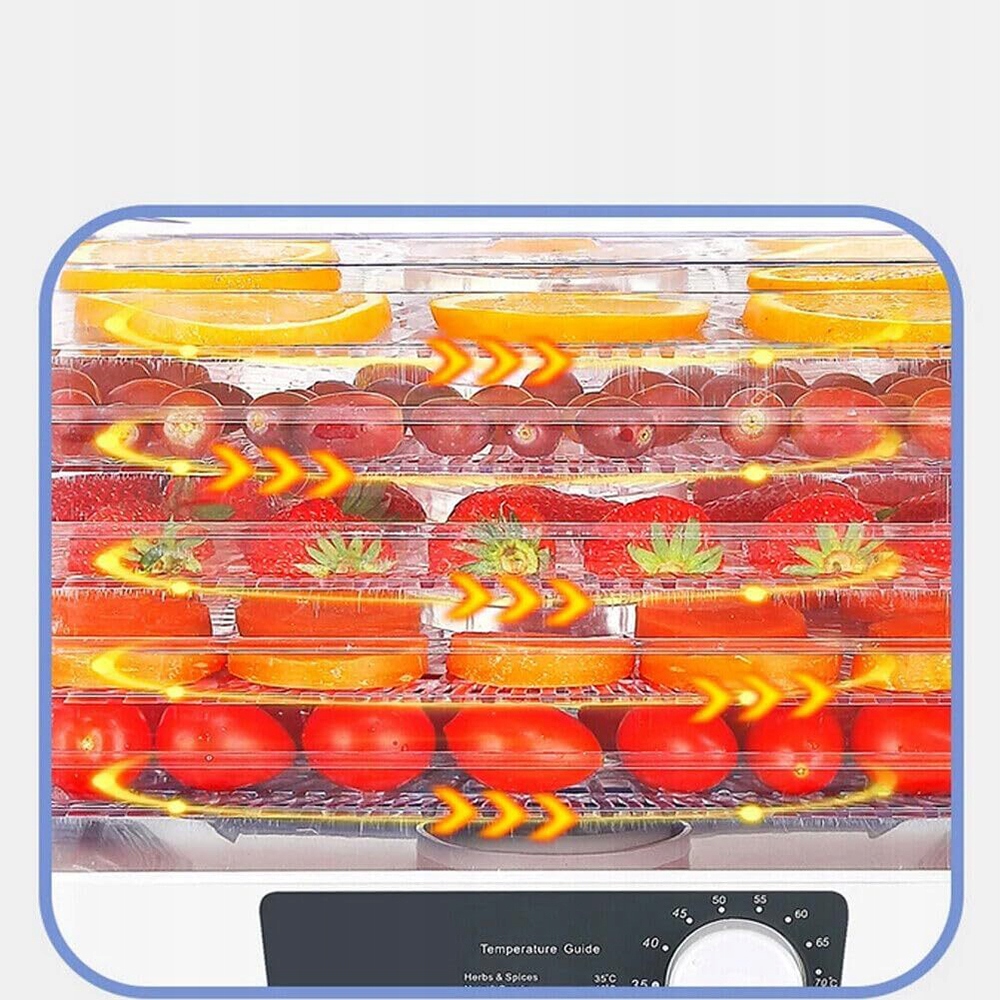 - Ця сушарка для фруктів розроблена з 5 полицями для сушіння (кожен шар має 3,2 см у висоту), які достатньо великі, щоб умістити більшість продуктів і забезпечити рівномірне сушіння. 5 лотків дозволяють зручно розкладати різні продукти та підвищують продуктивність.