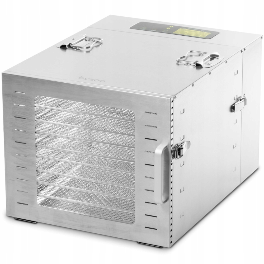Повністю виготовлено з нержавіючої сталі. Дегідратор Byzoo DH03 повністю виготовлений з нержавіючої сталі. Корпус виготовлений з товстої нержавіючої сталі з матовим покриттям, що робить його міцним у використанні. Піддони для сушіння виготовлені з нержавіючої сталі SUS304, що робить їх гігієнічними, високоякісними, стійкими та простими в чищенні. Через склови можете перевірити інгредієнти, не відкриваючи дверцята, щоб запобігти втраті тепла.