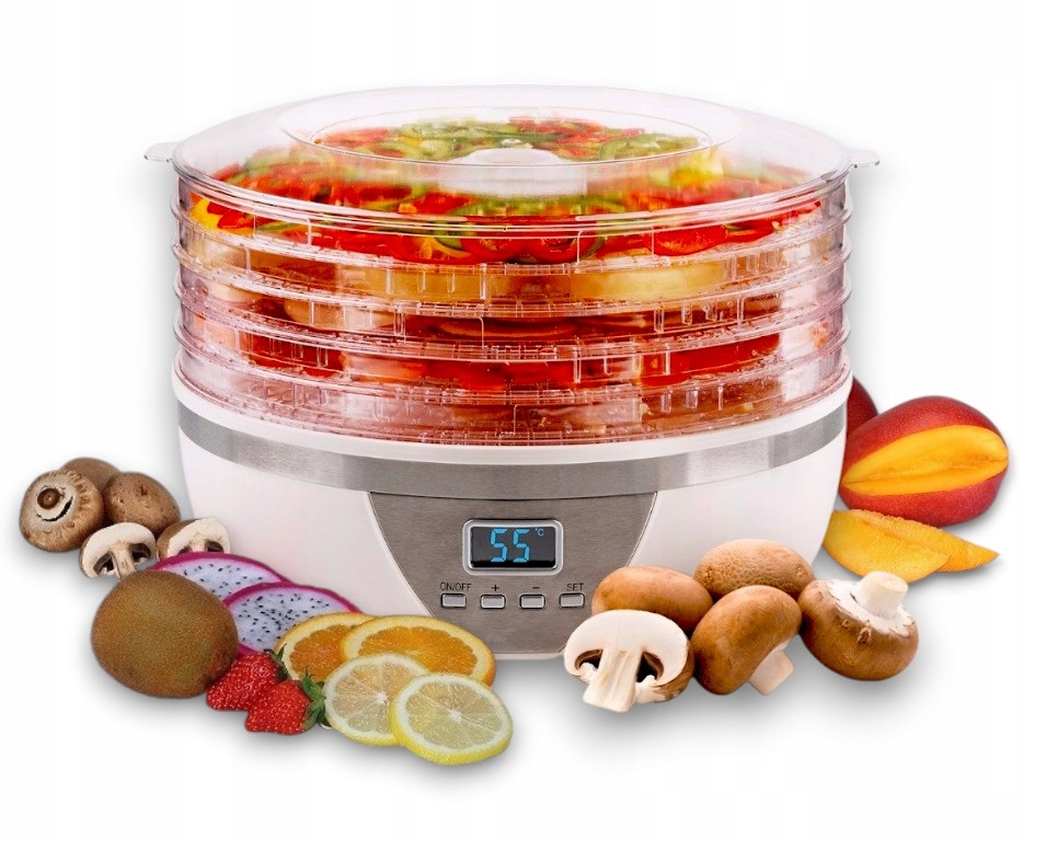 Просто розмістіть попередньо підготовлені продукти на ситах, встановіть на світлодіодному дисплеї відповідну температуру, при якій ви хочете сушити продукти, і запрограмуйте час роботи пристрою.