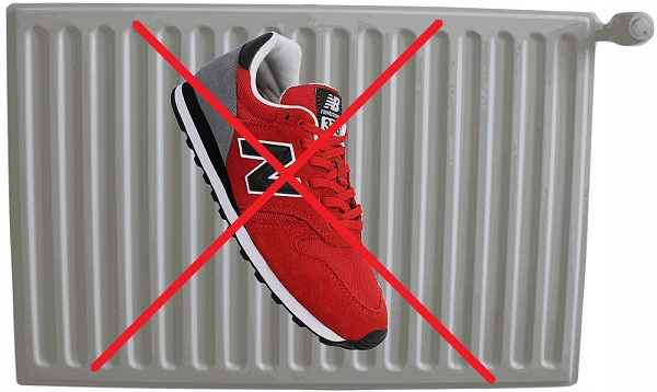 сушильне взуття на радіаторі може пошкодити їх. Взуття липке і не підходить для носіння.