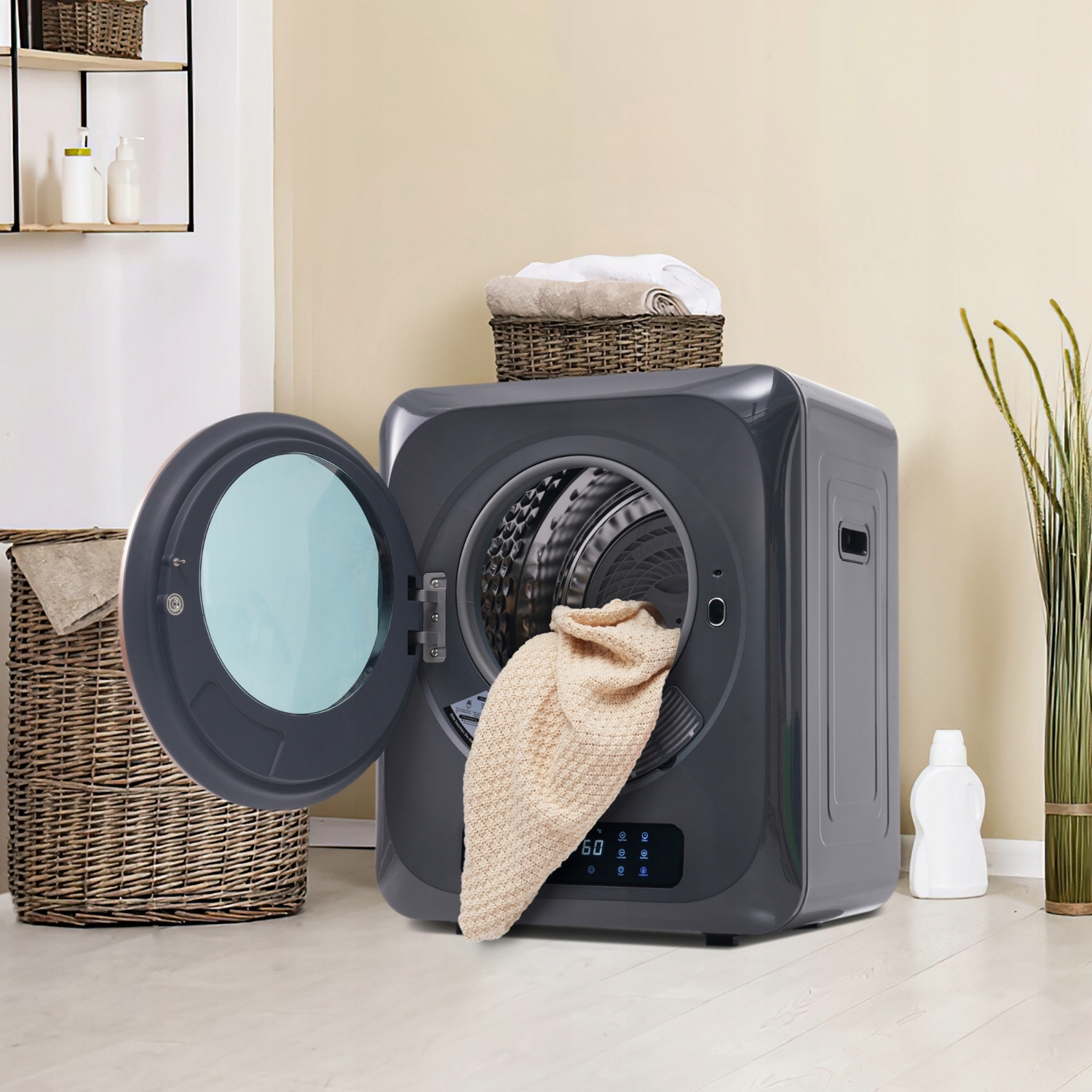 Захист від перегріву та кріплення на стіні: наша сушильна машина має захист від перегріву, що забезпечує безпечне та безпроблемне використання. Настінне кріплення економить простір, усуваючи необхідність нахилятися, щоб скласти одяг, що робить повсякденні справи та роботу по дому легшими та приємнішими.
