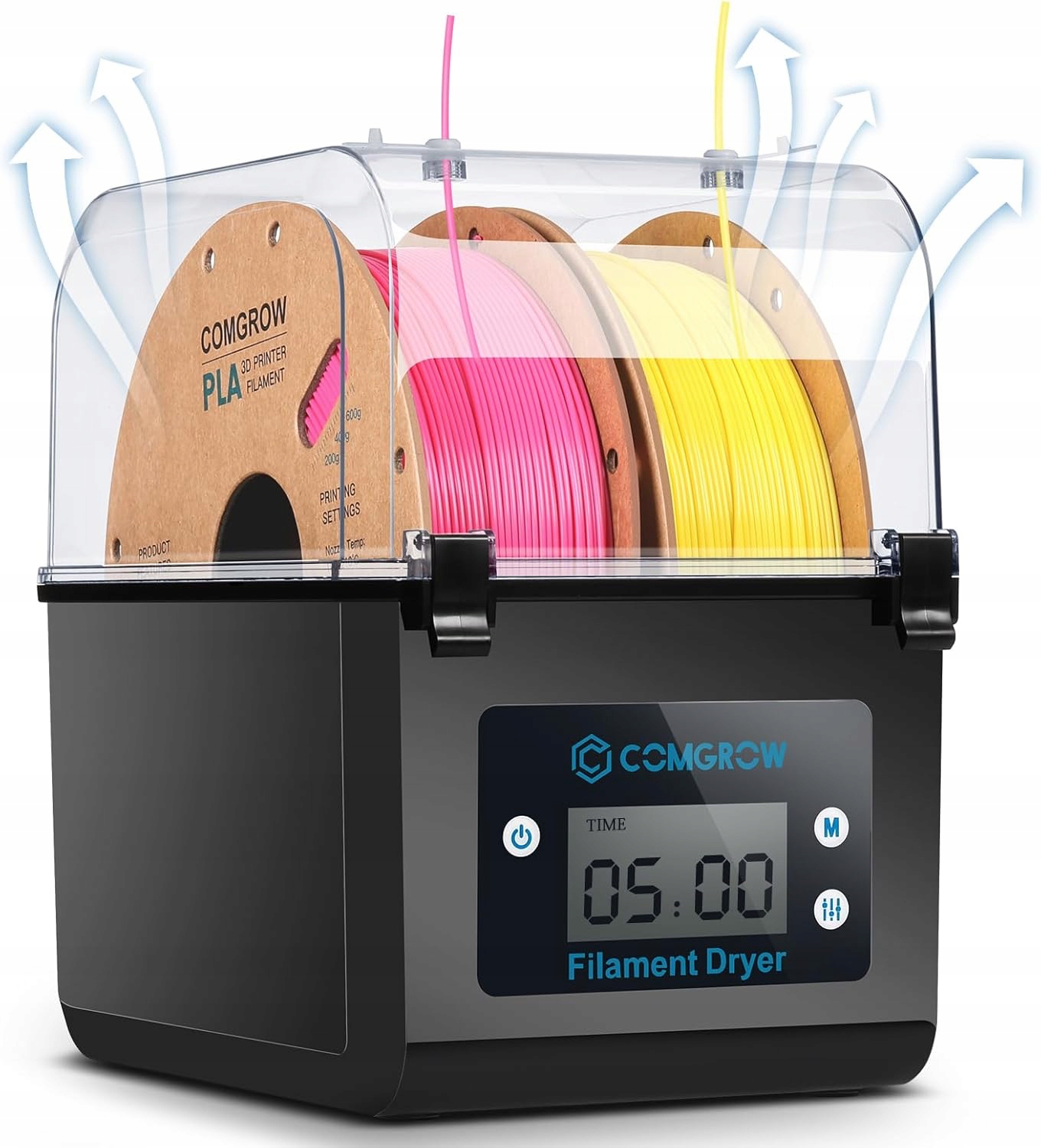 сушарка нитки та видалення вологи - сушарка для нитки для 3D -принтерів була розроблена таким чином, щоб нитка була сухим і видаляє вологу з різних типів ниток. Внутрішнє опалення під час друку забезпечує сухе середовище для зберігання для 3D -принтерів і зберігає нитку в сухому стані.