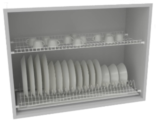 Dip -wage Drip для дворівневого побудованого посуду в підвісних кухонних шафах. У крапельця є дві полиці, виготовлені зі сталі та пластиковий піднос.