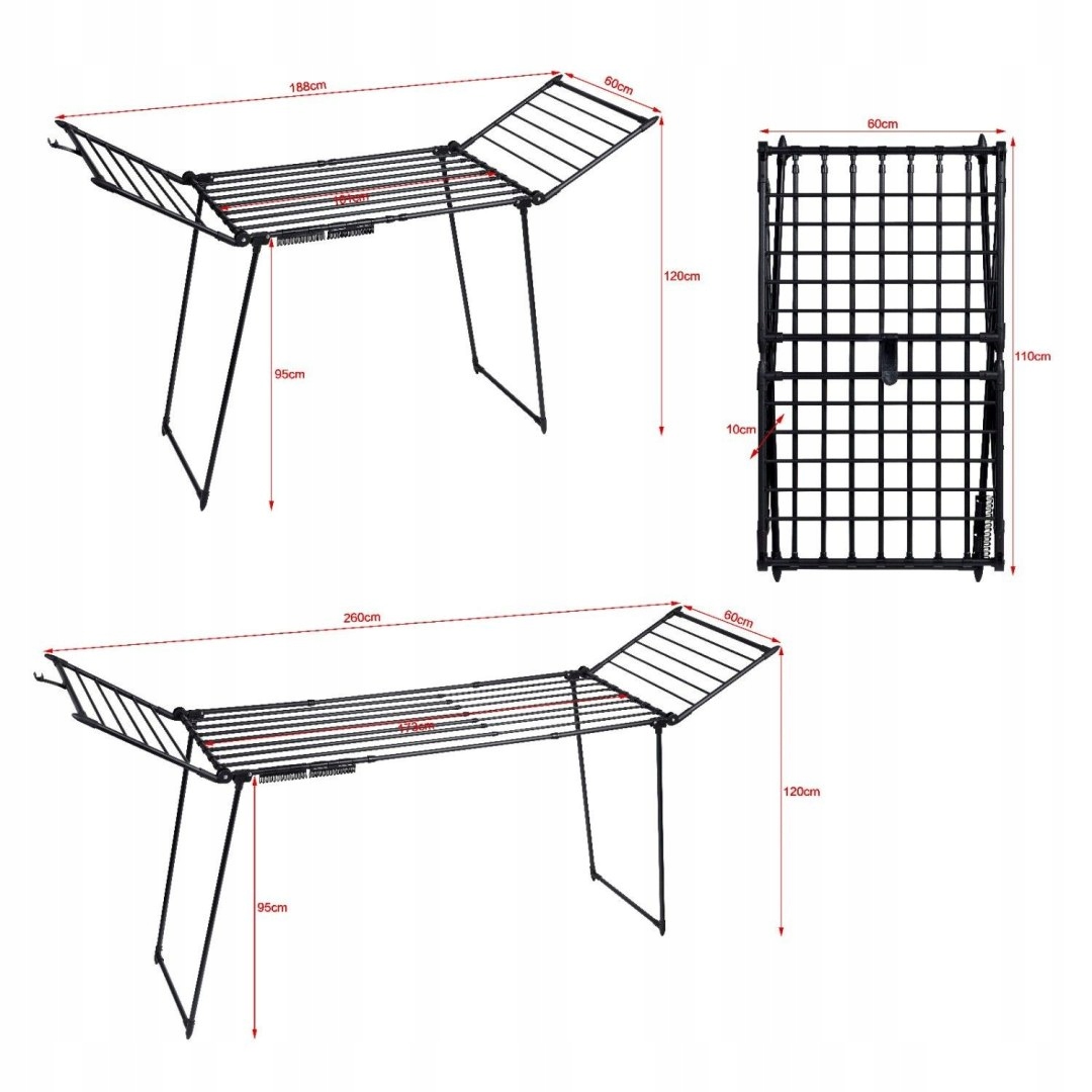 Складна сушильна машина — чудовий вибір для кожного дому. Виготовлений з високоякісної вуглецевої сталі з порошковим покриттям глибокого чорного кольору, він гарантує тривалу довговічність і стабільність. Можливість розміщення білизни до 27 метрів і максимальне завантаження до 20 кг роблять його надзвичайно функціональним і стійким до великих навантажень. Практичні гачки для білизни та шкарпеток додатково збільшують його корисність, значно полегшуючи повсякденну роботу по дому.
