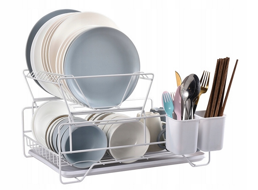 ЕЛЕГАНТНА СУШКА ДЛЯ ПОСУДУ З ПІДНОШЕННЯМ ТА БІЛИМИ КОНТЕЙНЕРАМИ ДЛЯ СТОЛОВОГО ПРИБОРУ.